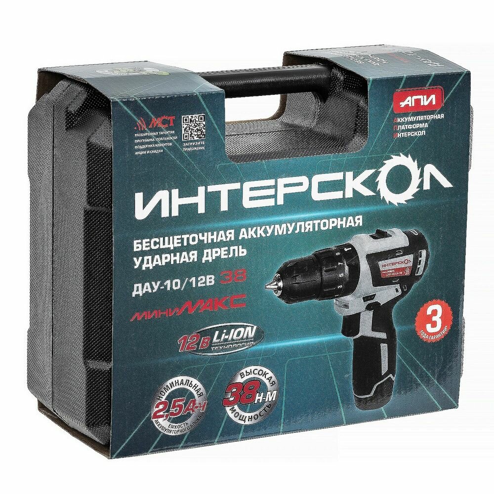 Бесщеточная аккумуляторная ударная дрель-шуруповерт ИНТЕРСКОЛ МиниМАКС ДАУ-10/12В 38 Нм 1450 об/мин 25500 уд. мин с 2 АКБ 2.5 Ач и ЗУ в кейсе 767.2.2.45
