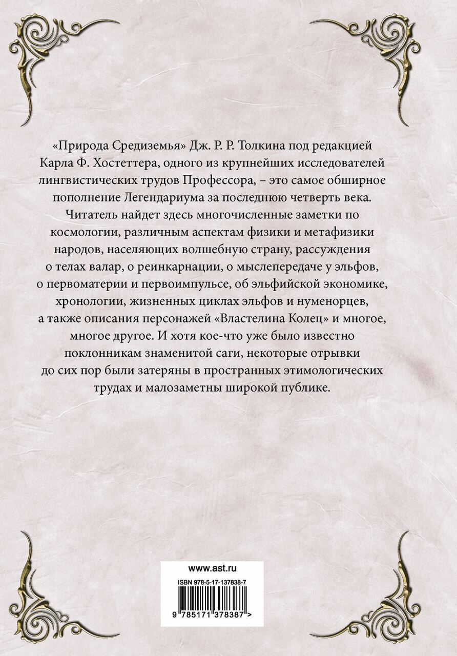 В книге «Природа Средиземья» представлены интереснейшие черновые материалы по истории Арды, прежде неизвестные широкой публике: подроб- ные математические расчеты темпов взросления и старения у людей и эльфов, рассуждения на такие фундаментальные темы как судьба и свободная воля, тело и дух, первоматерия и первоимпульс; подробные сведения о земле, флоре и фауне Нуменора; ответы на множество вопросов, которыми задавался Дж.Р.Р. Толкин, создавая свой многоплановый Легендариум.