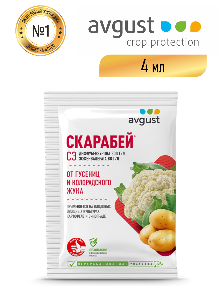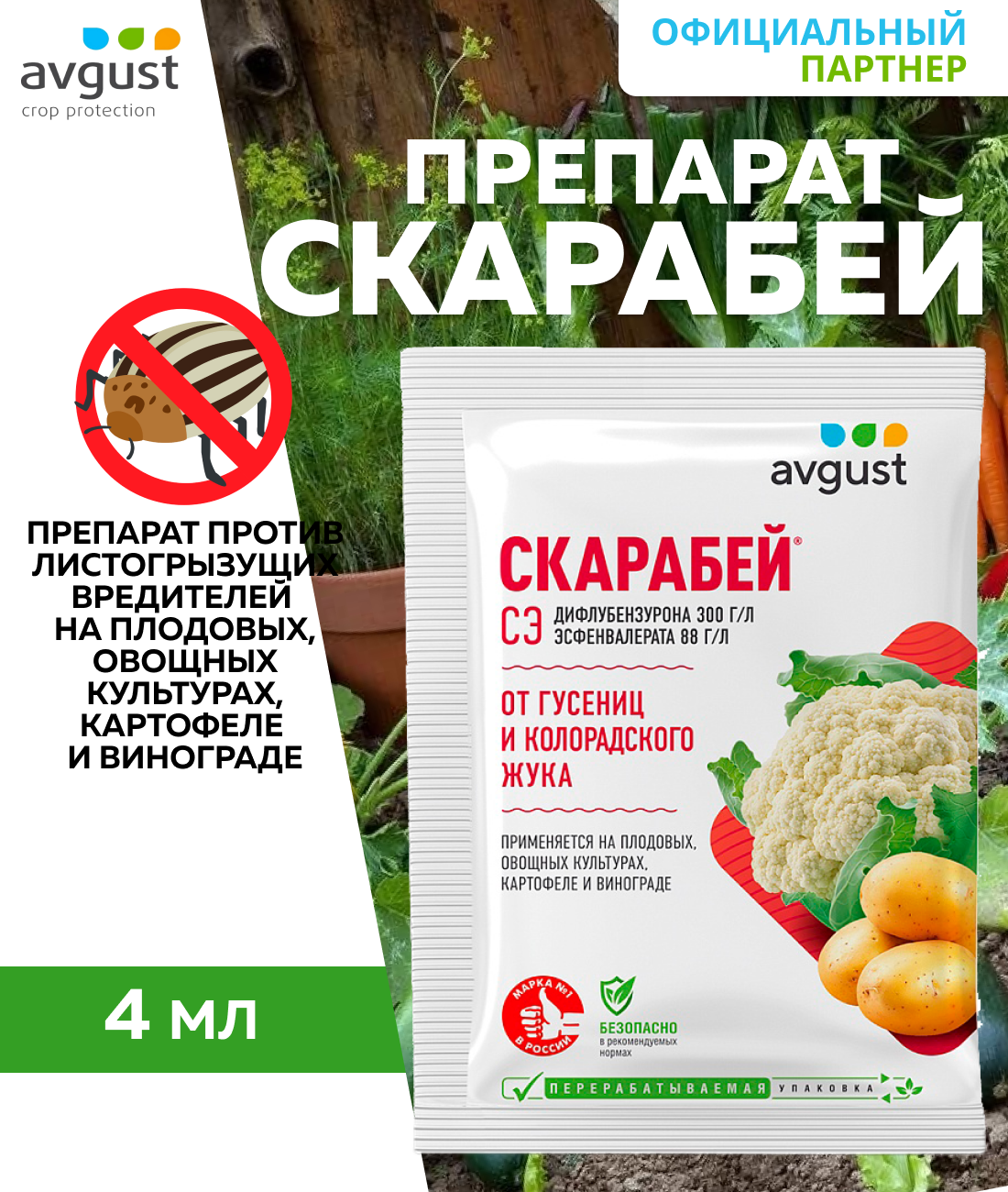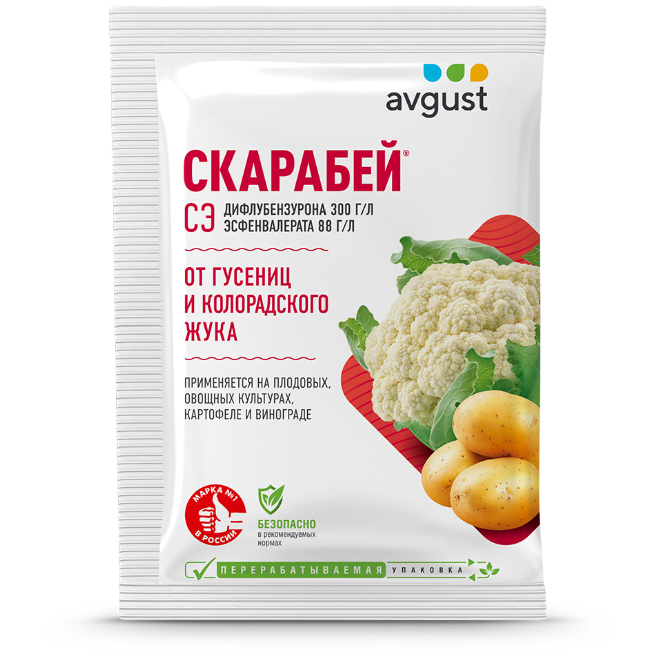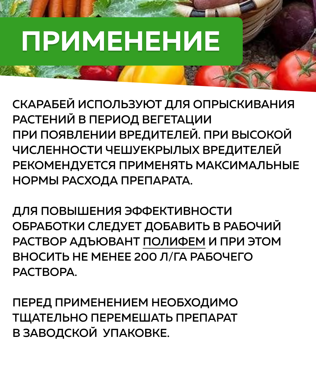 Инсектицид Скарабей - двухкомпонентный препарат против листогрызущих вредителей на плодовых и овощных культурах, картофеле и винограде.
