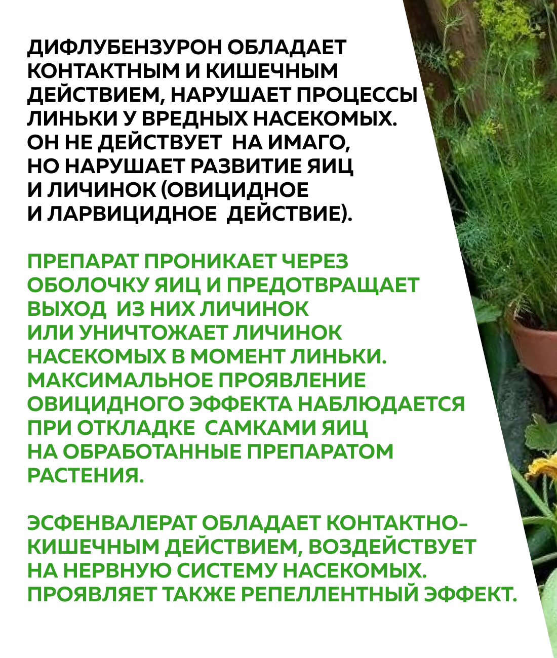 | Состав | Действующее вещество: 300 г/л дифлубензурона + 88 г/л эсфенвалерата. |