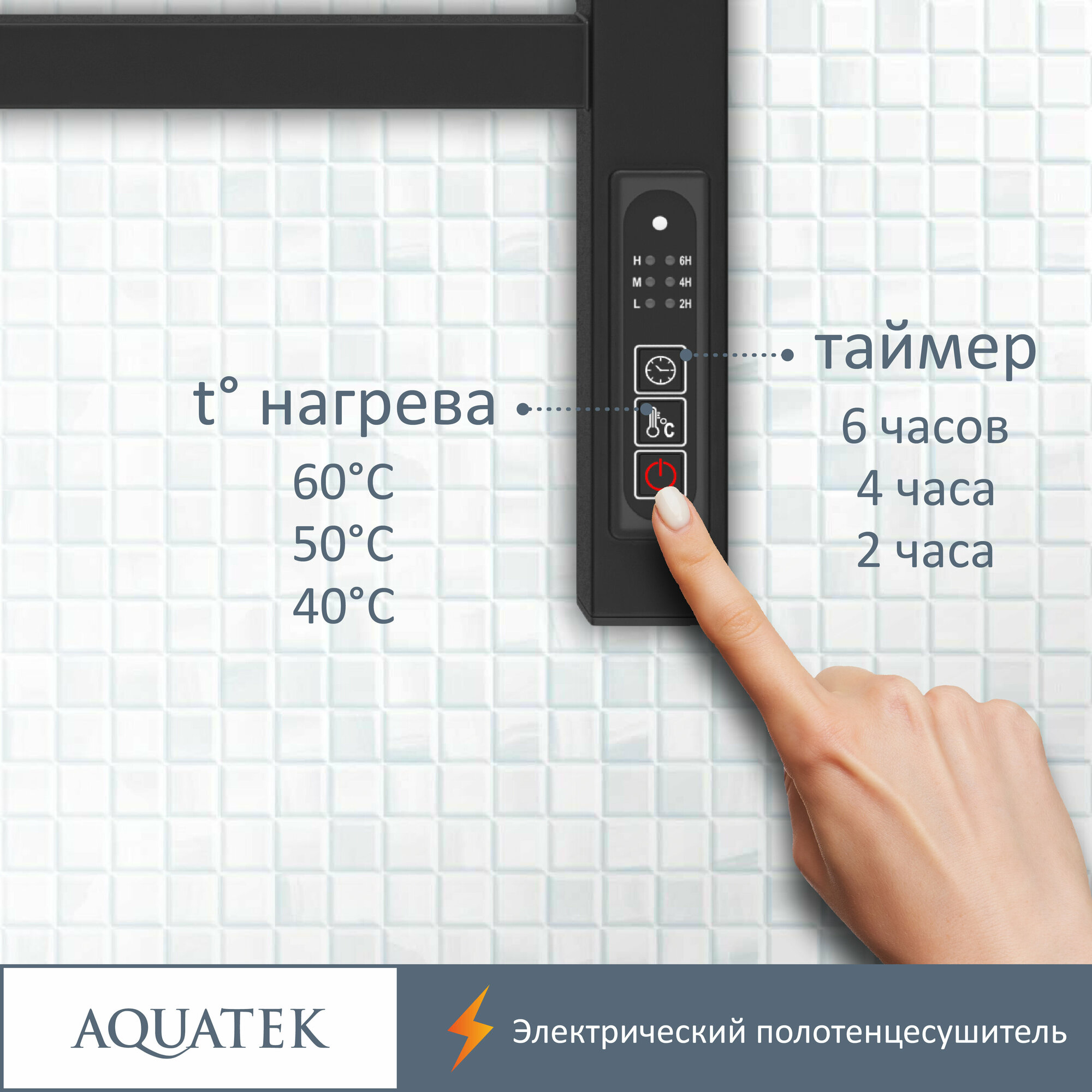 Стильный и функциональный полотенцесушитель Aquatek станет идеальным решением для вашей ванной комнаты, обеспечивая комфорт и уют. Полотенцесушитель Aquatek можно использовать не только для сушки белья, но и для обогрева небольшого помещения, что делает его незаменимым аксессуаром в любой ванной комнате. Особенности электрического полотенцесушителя Aquatek: -Стильный дизайн: полотенцесушитель имеет современный и элегантный вид, который идеально сочетается с любым интерьером ванной комнаты. -Эффективное отопление: благодаря продуманной конструкции полотенцесушителя, он быстро и равномерно прогревает воздух в помещении, создавая комфортную атмосферу. -Надежность и долговечность: полотенцесушитель изготовлен из высококачественной нержавеющей стали, что гарантирует его прочность, устойчивость к коррозии и длительный срок службы. -Использование в производстве роботизированной лазерной сварки обеспечивает: Надежность и прочность изделия на всю толщину трубы; Ровный и узкий шов за счет точной траектории сварки и четкую геометрию изделий. -Полимерное порошковое покрытие в цвете черный муар обеспечивает высокую устойчивость к коррозии, механическим повреждениям и воздействию различных химических веществ, что обеспечивает долгий срок службы изделий. Кроме того, полимерное порошковое покрытие не содержит вредных химических веществ и является экологически безопасными. -Простота установки и полная комплектация, изделие готово к установке: все необходимое для монтажа уже в комплекте. Для монтажа не потребуется профессиональная помощь или использование сложных инструментов. Достаточно закрепить полотенцесушитель на стене в непосредственной близости от розетки. Габарит выступа от стены регулируется телескопическими крепежами. -Экономичное потребление: электрический полотенцесушитель Aquatek потребляет на уровне 100 Вт/ч., что соизмеримо с потреблением обычной лампочки. -Безопасность продукции подтверждена сертификатом соответствия.