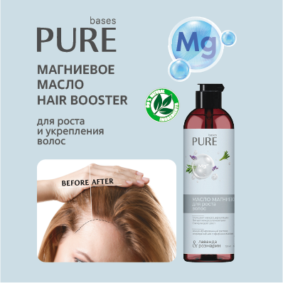 Масло магниевое для роста волос. Улучшает микроцеркуляцию . Питает микроэлементами. Стимулирует рост. Идеально подходит для использования в домашних условиях, а также в бане и сауне! магниевое масло компенсирует нехватку магния в организме, улучшает микроциркуляцию крови и лимфы, питает микроэлементами, останавливает выпадение и стимулирует рост волос. Способ применения: перед применением тщательно встряхнуть флакон. Нанести на сухую кожу головы, надеть шапочку для душа и сверху обернуть полотенцем. Возможно легкое пощипывание. Через 15-20 минут смыть водой, используя шампунь Pure Bases.