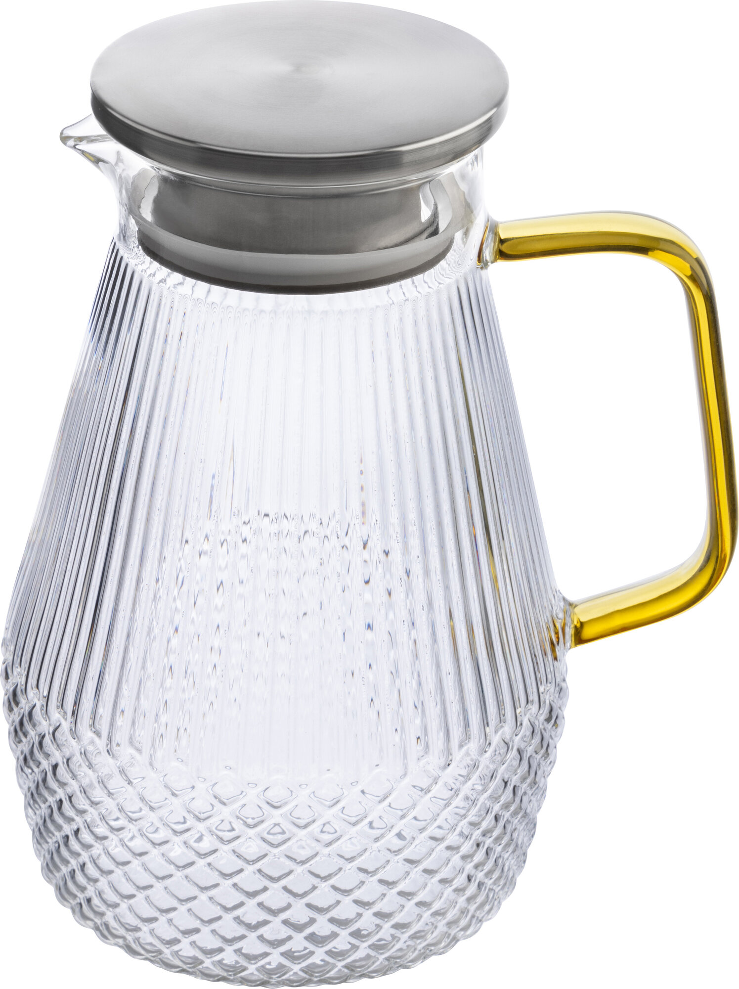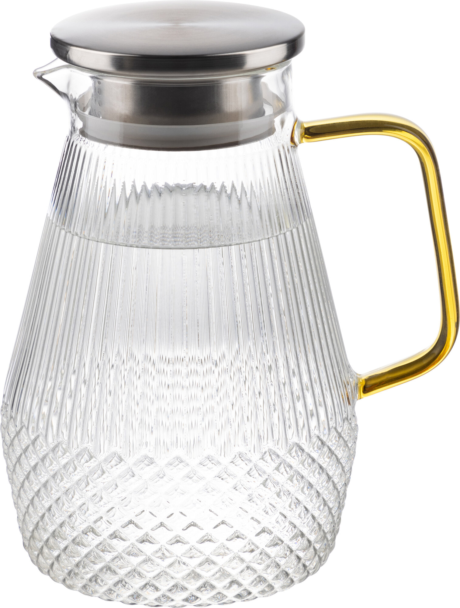 Кувшин AROMA 1,6 л из боросиликатного рельефного стекла с крышкой-фильтром из нерж стали, с ручкой из цветного стекла.Материал: термостойкое боросиликатное стекло+304 нерж сталь+силикон. Упаковка: цветная коробка + пуз пленка + белая бумага.4?10-6 - коэффициент линейного расширения.