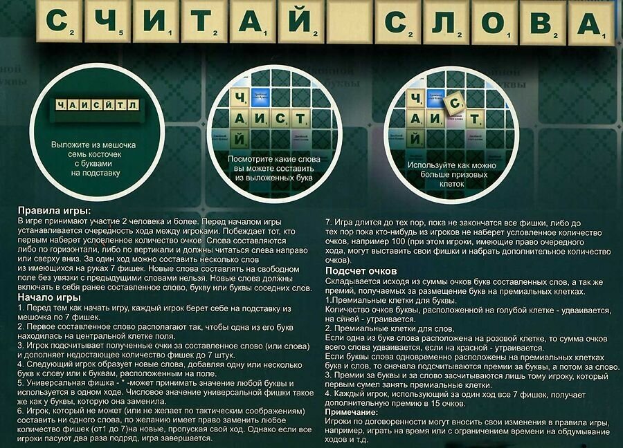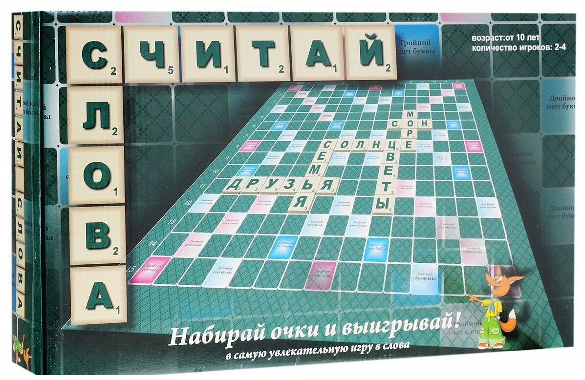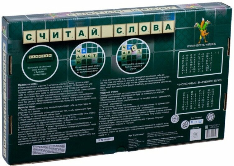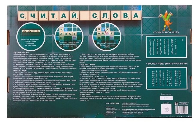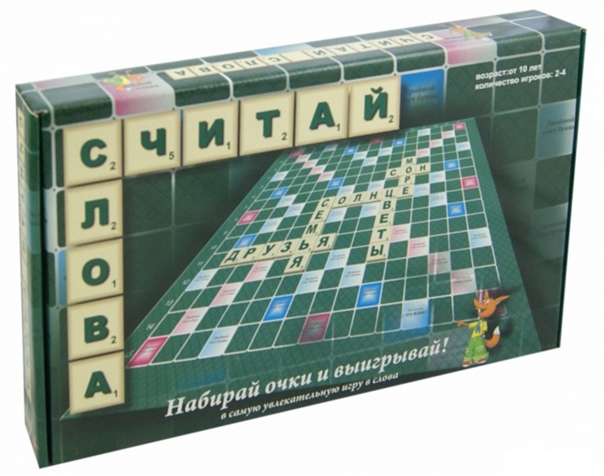 | Описание | Настольная игра "Считай слова" от компании "Эра" уже давно скрашивает досуг детей и взрослых во всем мире. Возрастные рамки практически не ограничены. Игра ориентирована на участников от десяти лет и старше.,Ее суть заключается в том, что игроки, доставая фишки-косточки с буквами из маленького мешка, раскладывают их по индивидуальным подставкам, после чего ими составляются слова на основном поле таким образом:по вертикали или по горизонтали. Читаются они слева направо.,Очередные составленные слова включают в себя те, что были созданы прежде. Согласно правилам, раскладывать сокращенные слова, слова аббревиатуры и т.п. не запрещено, что также добавляет забавные краски в процесс игры.,За один ход игроку можно составить столько слов, на сколько у него хватит косточек, а именно:7 фишек на человека. А если умелый игрок умудрится использовать все 7 косточек за один ход, то ему присуждаются 15 бонусных очков.,В комплект игры входят сто тридцать косточек и мешочек для них, четыре подставки и основное игровое поле. Игра включает в себя обучающий момент, а именно |