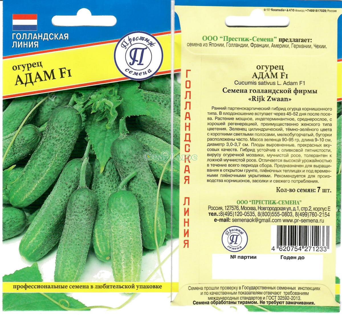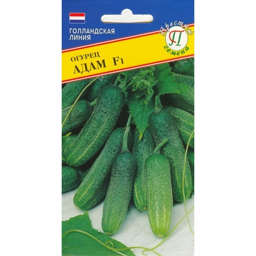 **Семена огурец Адам F1** — раннеспелый гибрид, от первых всходов до начала съема овощей проходит 45-50 дней. Рекомендован для защищенного грунта. Растения плетистые, зеленцы цилиндрические, вес — до 95 г. Поверхность мелкобугорчатая, мякоть хрустящая, сочная, без горечи. Подходят для употребления в пищу в свежем виде и в консервацию. Урожайность составляет до 10 кг с 1 квадратного метра посевов.
