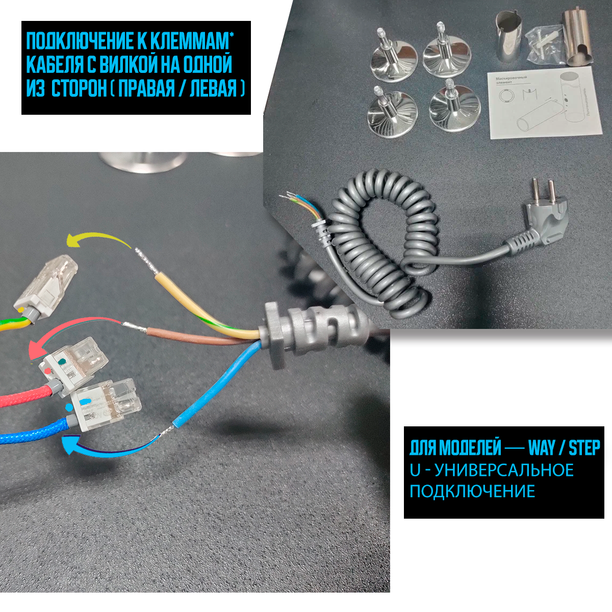 - Подключение: электропровод с вилкой / скрытое электрическое подключение.