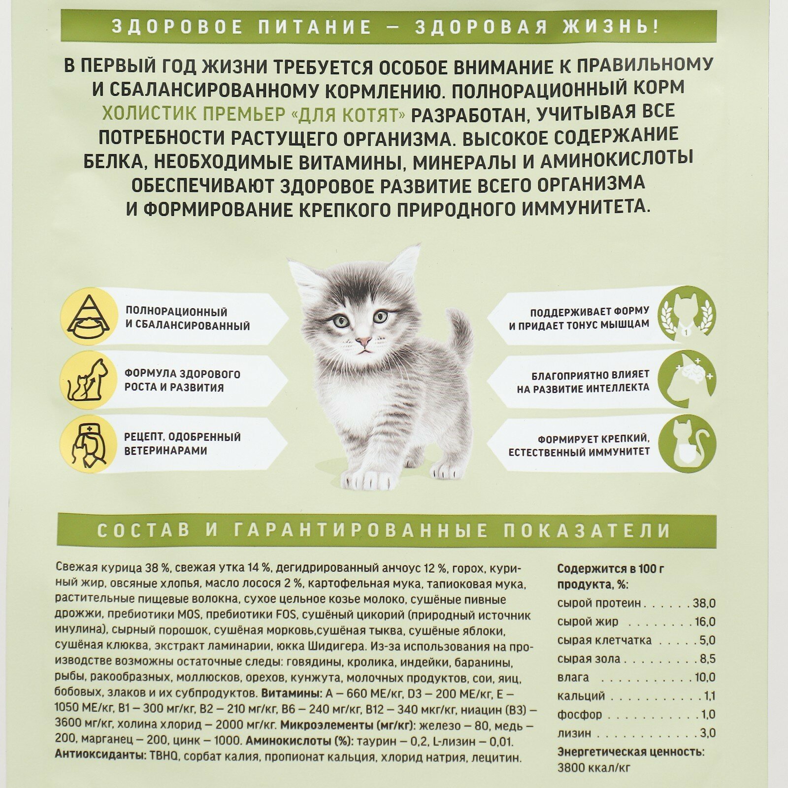 Важно обеспечить правильное питание и рацион для растущих котят, чтобы поддерживать их здоровье и развитие. Корм Холистик Премьер «Для котят» специально разработан, чтобы удовлетворить все потребности молодых организмов. Богатое содержание качественного белка, необходимых витаминов, минералов и аминокислот обеспечивает правильное формирование иммунитета и здоровое развитие котят.