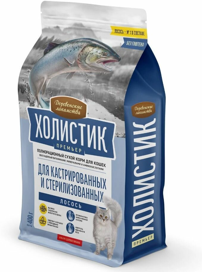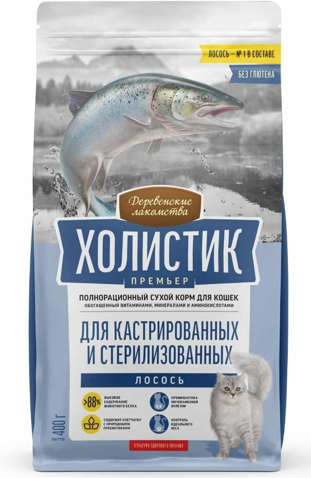 ДЕРЕВЕНСКИЕ ЛАКОМСТВА Холистик Премьер Корм сух.лосось д/стерилизованных кошек 400г (79213232)