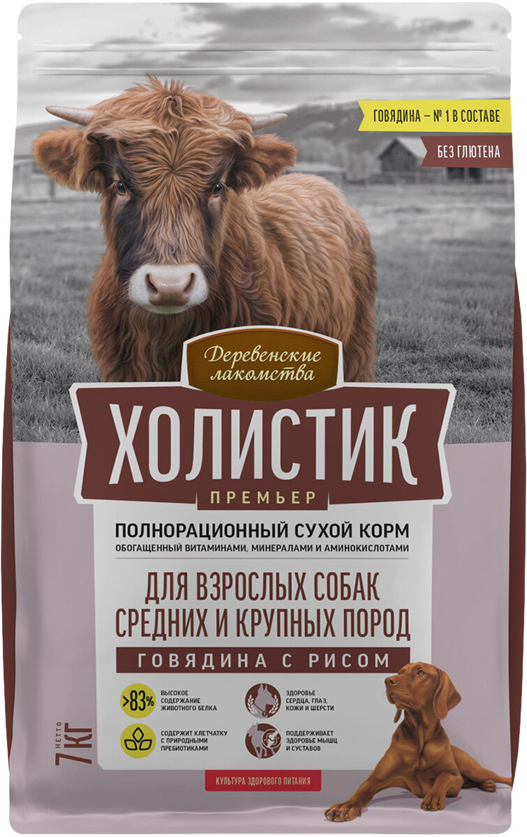 ДЕРЕВЕНСКИЕ ЛАКОМСТВА Холистик Премьер Корм сух.говядина с рисом д/собак средн./круп.пор.12кг (79213959)