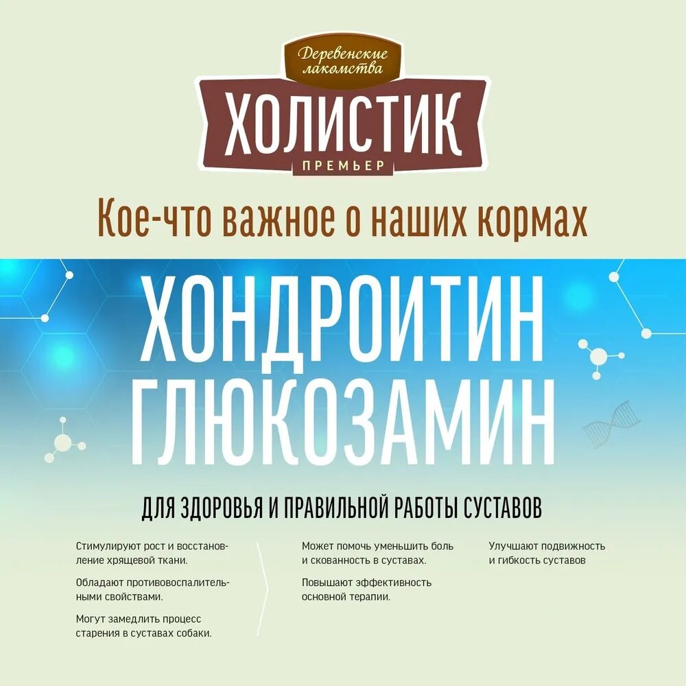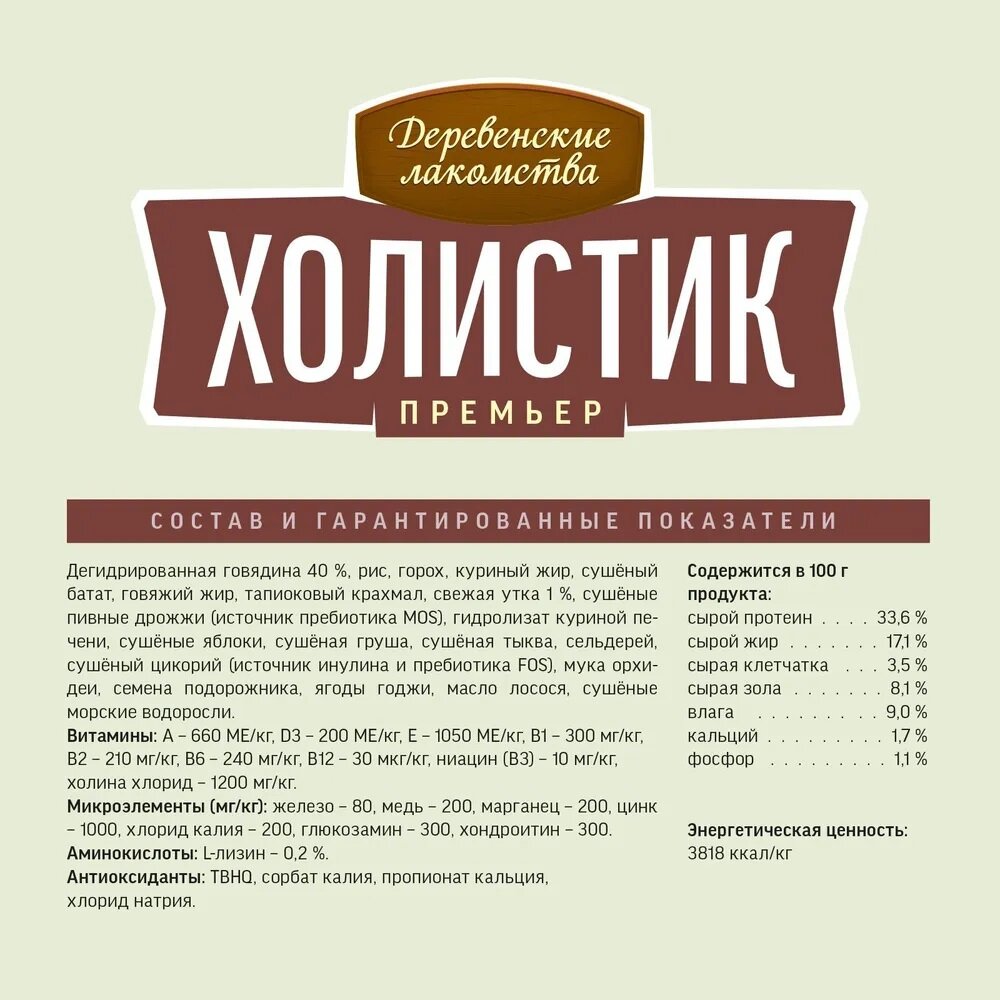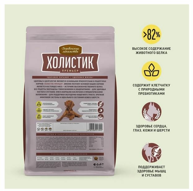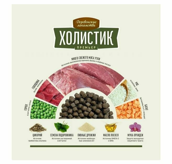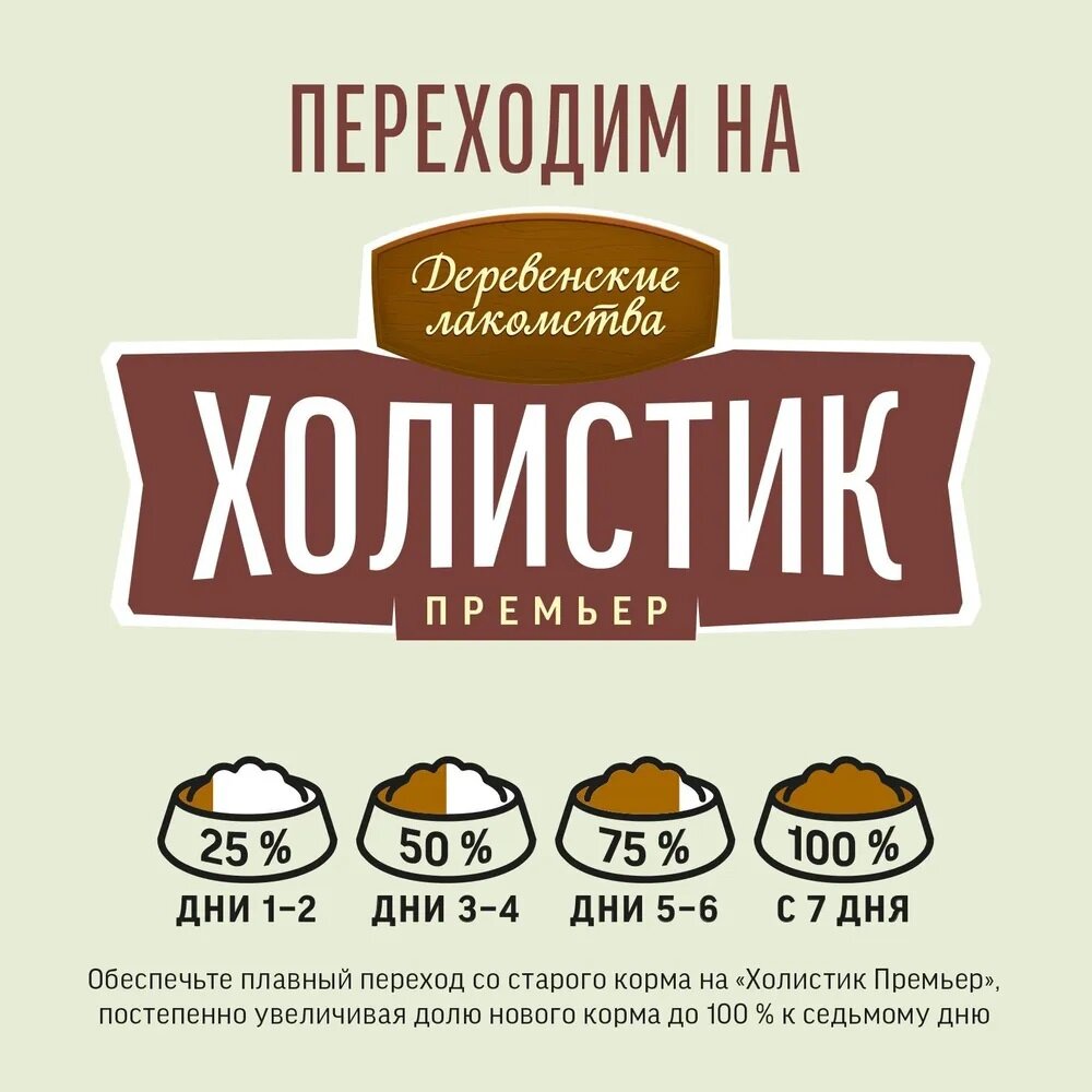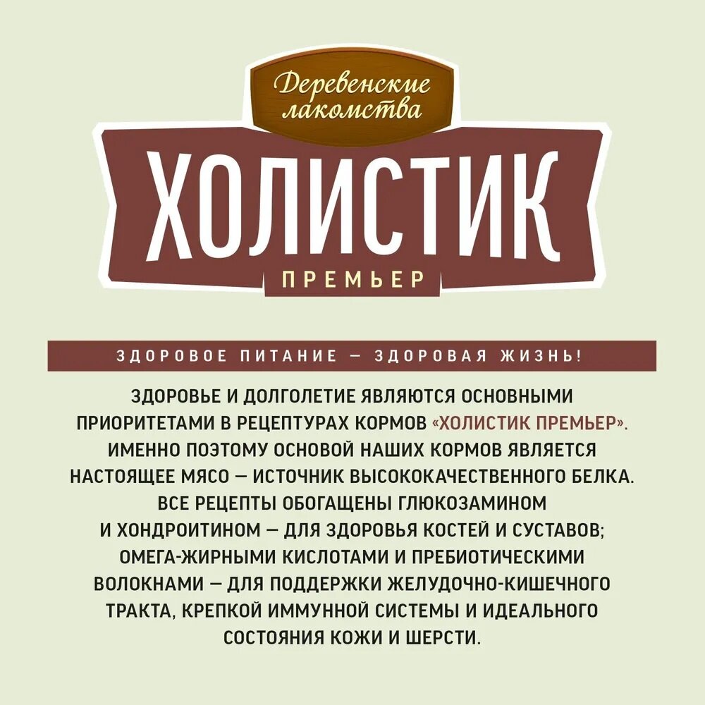 Сбалансированный, натуральный, полнорационный корм «Деревенские лакомства Холистик Премьер» обеспечивает питомцев всем необходимым для поддержания здоровья на каждом этапе жизни.