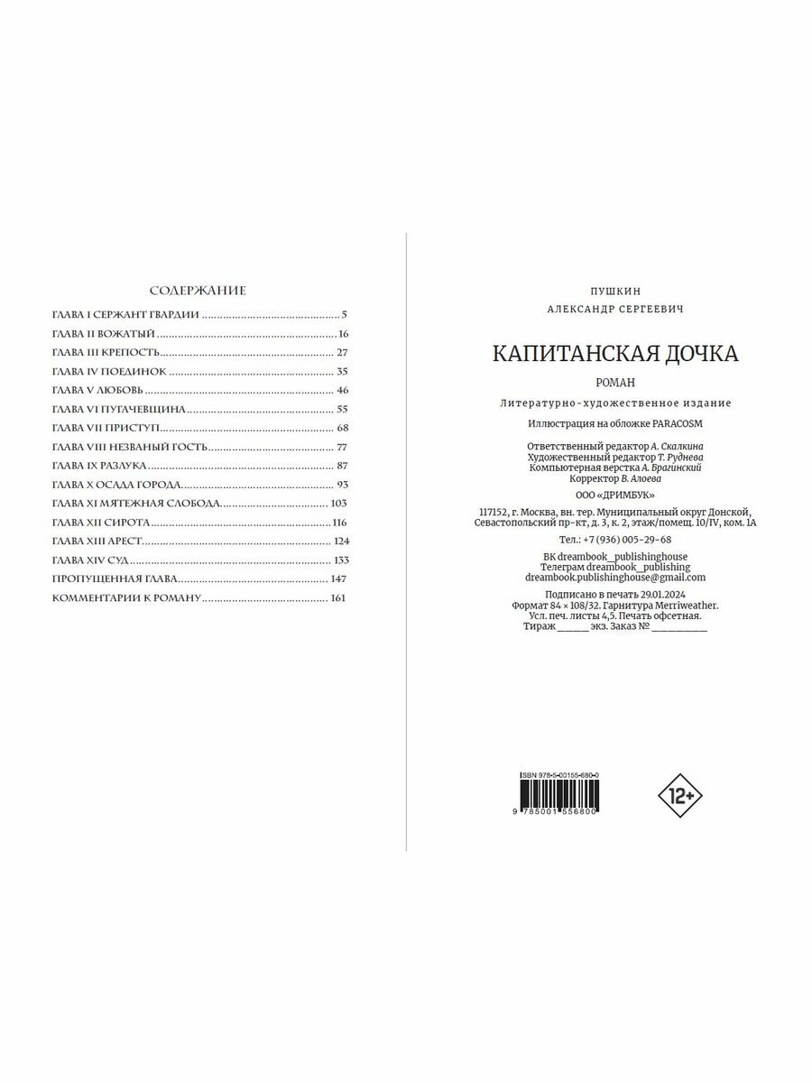 Роман Александра Сергеевича Пушкина (1799-1837) - классика отечественной литературы и одного из самых значимых русских писателей - историческая драма о чистой и верной любви на фоне народного восстания Емельяна Пугачева. Удивительно современная и захватывающая история о том, как любовь и долг могут наделить человека мужеством и удачей, чтобы противостоять бедствиям. Здесь есть место политическим интригам, подлому предательству и искренней жертвенности. Книга снабжена подробными комментариями к тексту. В оформлении использована иллюстрация известной художницы ParaCosm.