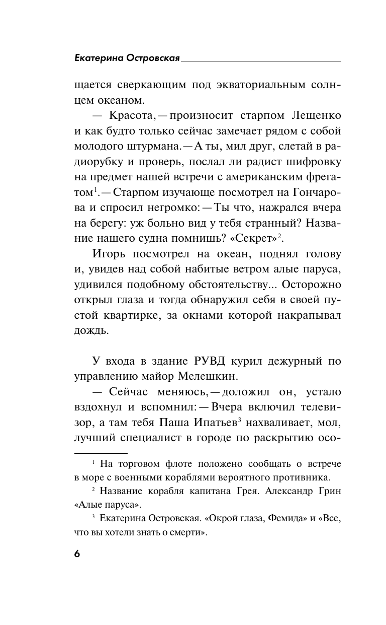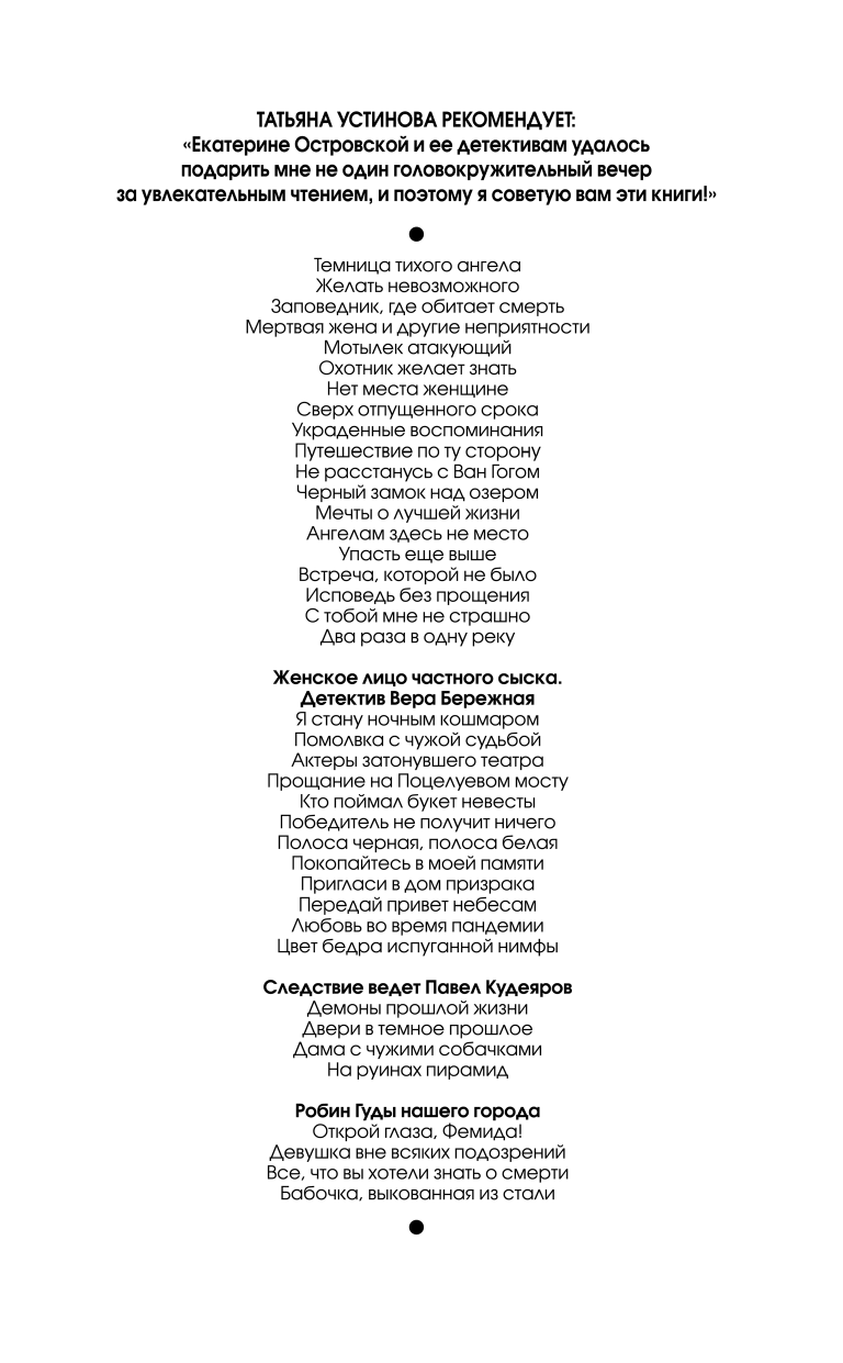 По просьбе девушки, которая ему очень нравится, лучший сыщик Санкт-Петербурга подполковник Гончаров разбирается в странной истории с задержанием ее отчима. Уважаемого человека, доктора наук, бывшего ректора престижного вуза почти год держат в камере. Основанием для задержания стали показания ректора провинциального филиала, пойманной на взятках и растрате. И заявление этой дамы, и сама ее личность вызывают у опытного сыщика сомнения, которые он пытается развеять или подтвердить. А в результате сам оказывается в большой беде. Татьяна Устинова рекомендует: "Островская играет жизнями, тасует героев, заставляет их совершать неожиданные и странные поступки, а читателя - с замиранием сердца следить за ними и гадать: сработает, не сработает, выберутся, не выберутся!. Сюжет то и дело поворачивает в какую-то другую сторону и на полной скорости несется дальше. Это почти невозможно, но ей удается удержаться на этих виражах!. И очень хочется, чтобы у героев все получилось!. И финал! Он всегда феерический, во всех отношениях".