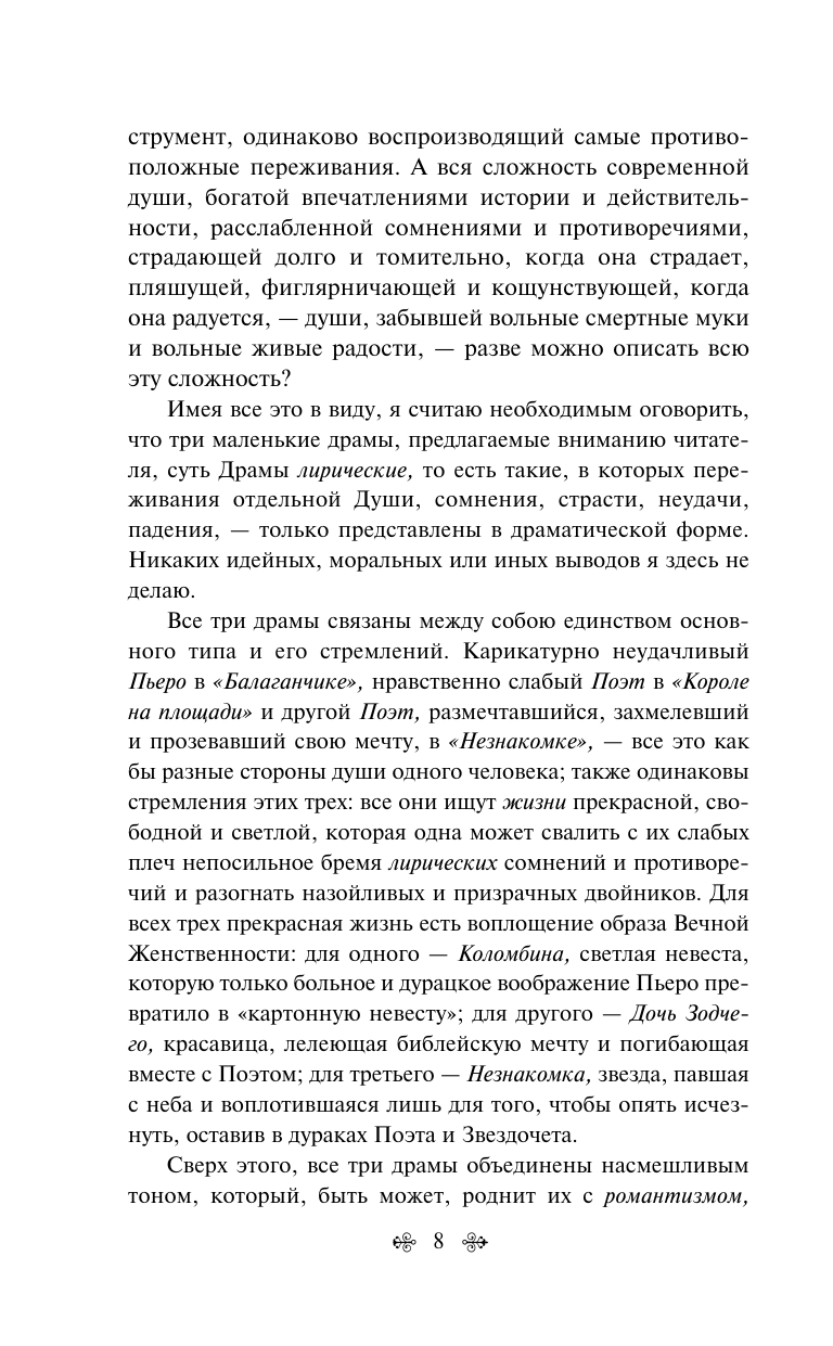 Книга Александра Блока, которую вы держите в руках, представляет из себя важное собрание ключевых произведений Блока-драматурга. Тонкий поэт и проницательный психолог, Блок создаёт невероятные по эмоциональному напряжению миры и ситуации, которые открывают читателю грани реальности, скрытые за пеленой (или, как мог бы выразиться сам Блок — «туманом») повседневной жизни.