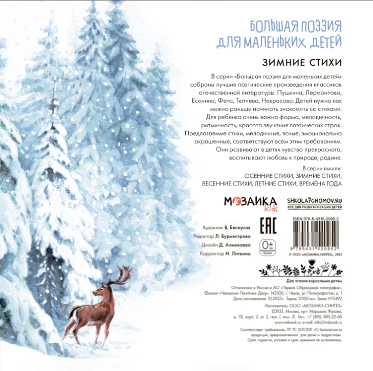 Зимние стихи (Большая поэзия для маленьких детей), сборник стихов В книге «Зимние стихи» серии «Большая поэзия для маленьких детей» собраны лучшие поэтические произведения классиков отечественной литературы: Пушкина, Лермонтова, Фета, Тютчева, Некрасова, Есенина и других, посвященные зиме. Детей нужно как можно раньше начинать знакомить со стихами. Для ребенка очень важна форма, мелодичность, ритмичность, красота звучания поэтических строк. Предлагаемые стихи, мелодичные, ясные, эмоционально окрашенные, соответствуют всем этим требованиям. Они развивают в детях чувство прекрасного, воспитывают любовь к природе. Кроме того, эти стихи, дополненные великолепными акварельными иллюстрациями Владимира Белоусова, познакомят маленьких читателей с удивительным миром природы в зимнее время.