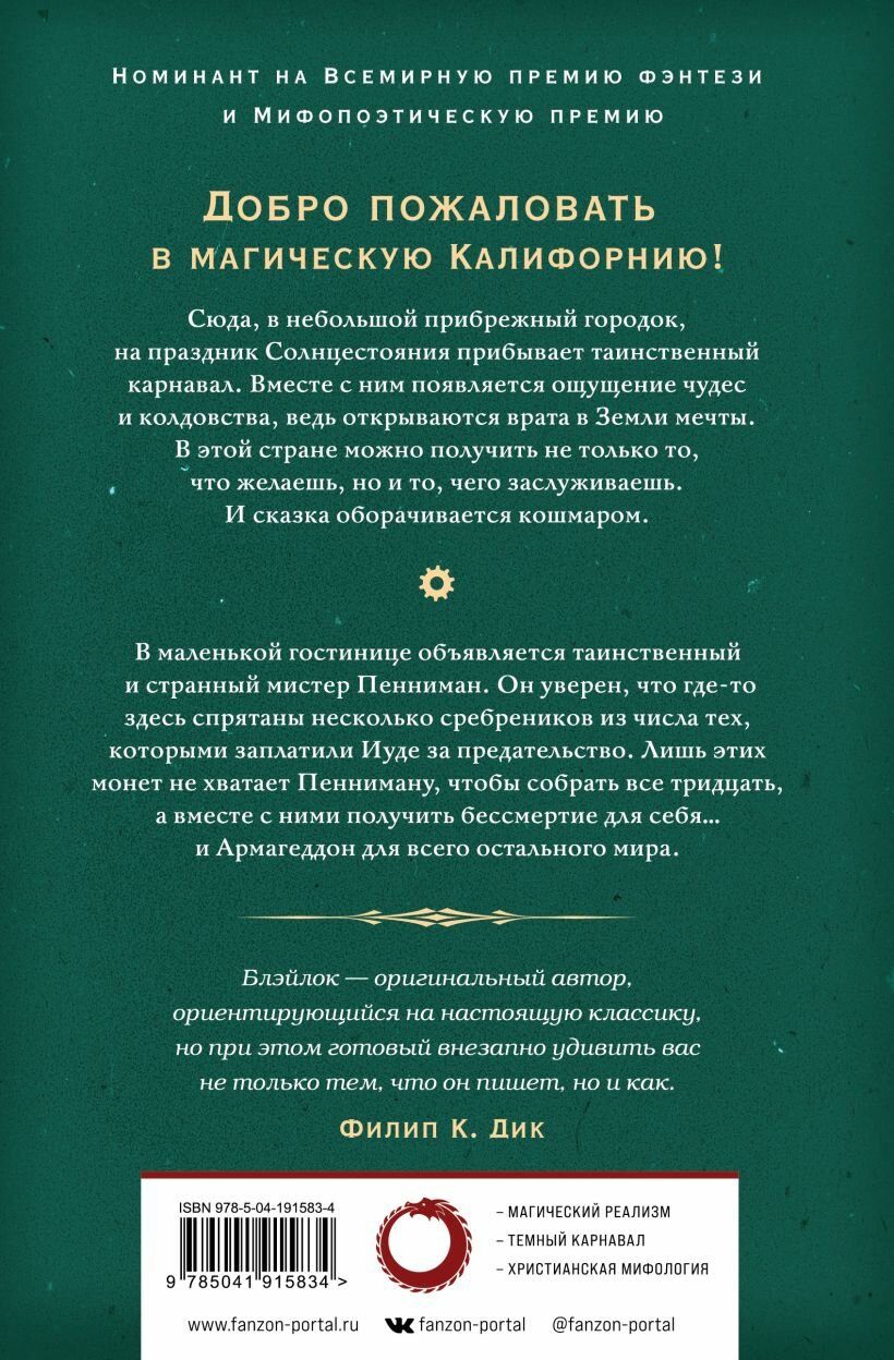 От лауреата Всемирной премии фэнтези и премии Филипа К. Дика. Ни один писатель со времен Рэя Брэдбери не создавал столь волшебный и реальный мир. Добро пожаловать в волшебную Калифорнию! Когда на берег выбрасывает ботинок размером с лодку и гигантские очки, трое городских сирот - Джек, Скизикс и Хелен - понимают, что происходит что-то неладное, да и старый призрак на чердаке приюта склонен с ними согласиться. В город приезжает зловещий карнавал, которым руководит мрачный джентльмен, имеющий способность превращаться в ворона. Человек размером с мышь, прячущийся в лесу, оставляет Джеку эликсир, который, возможно, позволит ему перейти во время Солнцестояния в другой мир, в таинственные Земли мечты, где хранится ключ к прошлому Джека и где начнутся их приключения. Две тысячи лет назад жил человек, который продал властям ценную информацию за тридцать сребреников. Его звали Иуда, и потом он повесился. Однако монеты все еще существуют - и по-прежнему обладают неуловимой властью над всеми, кто на них претендует. Особенно на мистера Пеннимана, которому не хватает всего нескольких серебряных монет, чтобы собрать их все, обрести бессмертие и запустить конец света. "Красиво, пугающе и волнующе одновременно. Эта книга для любителей живого языка и для тех, кто разделяет мечты автора. Блэйлок - волшебник! " - Орсон Скотт Кард о "Земле мечты" "Чудесное путешествие на поезде в нетипичное фэнтези". - Патриция Маккиллип "Мистер Блэйлок - оригинальный автор, ориентирующийся на настоящую классику, но при этом готовый внезапно удивить вас не только тем, что он пишет, но и как". - Филип К. Дик "Необыкновенный американский сказочник". - Уильям Гибсон "Это лучший роман Блэйлока - мощный, волшебный, напряженный и смешной, он плывет по сверхъестественным глубинкам северного калифорнийского побережья, и никто из читателей никогда не сможет покинуть его пейзаж сонных прибрежных городков, странных песен, доносящихся с моря, и огромных, неизвестных городов, виднеющихся на сумеречных горизонтах. Автор - лучший из современных писателей, а этому роману суждено стать классикой в своем жанре". - Тим Пауэрс о "Земле мечты" "Поразительная и прекрасно раскрытая сюрреалистическая фантазия. Странная, сложная, мудрая, оригинальная, восхитительная - не пропустите! " - Kirkus Reviews о "Земле мечты" "Этот роман должен узаконить позицию автора как законодателя литературной моды, который не просто исследует старое, а открывает новые горизонты". - San Francisco Chronicle о "Последнем сребренике" "На фоне лирического пейзажа побережья Южной Калифорнии всевозможные теории заговора сталкиваются в веселом балагане, чтобы создать еще одну странную и замечательную книгу". - Publishers Weekly о "Последнем сребренике" "Странные и удивительные вещи в изобилии. Автор хорошо использует прибрежную местность, извлекая свой собственный бренд магии из знакомых мест и привычных вещей. Хотя библейские заговоры и ревизионистские писания сейчас на пике популярности, Блэйлок опередил интерес к ним на несколько лет вперед". - SFF Chronicles о "Последнем сребренике" "Удивительное и загадочное очарование, наполненное персонажами, которые обычно встречаются в романах Джона Ирвинга". - Booklist о "Последнем сребренике"