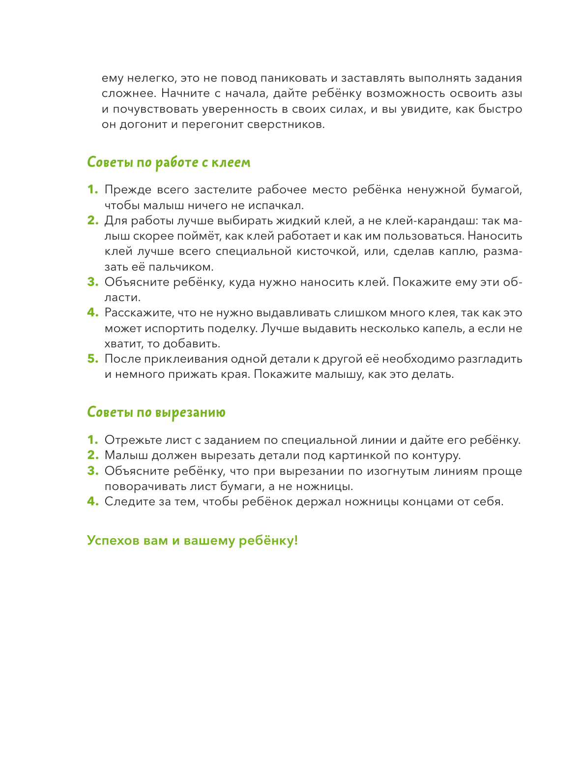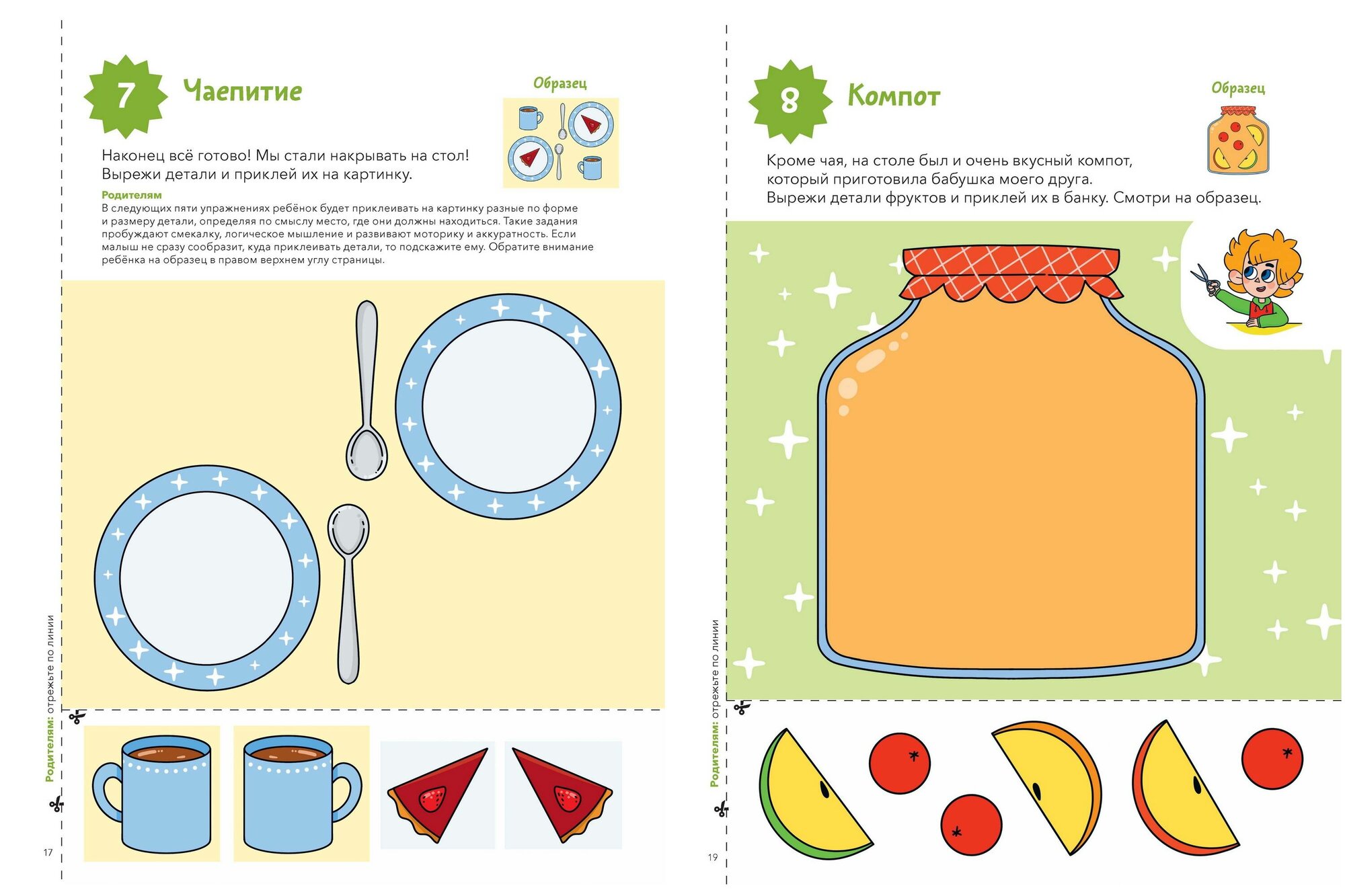 Благодаря тетради «Учимся клеить» ребёнок научится аккуратно приклеивать на страницу фигуры разной формы на отмеченную область, склеивать картинки, точно совмещая линии, и делать простые аппликации. Для работы с тетрадью необходимо уметь вырезать, но если ваш малыш пока не освоил этот навык, вы можете помогать ему вырезать детали.