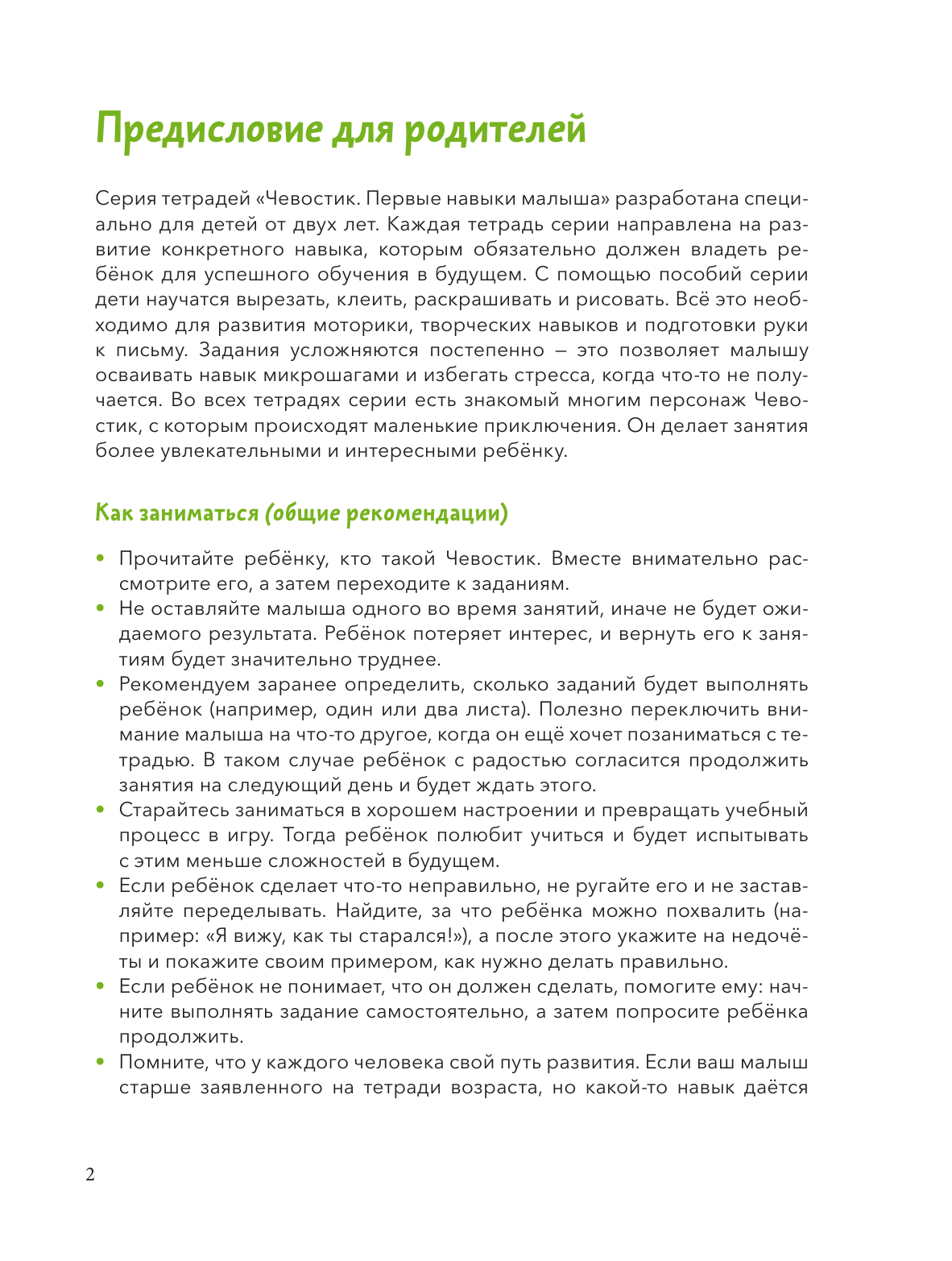 Серия тетрадей «Чевостик. Первые навыки малыша» создана для занятий с детьми от 2 лет и направлена на развитие ключевых навыков, без которых ребёнок не сможет обойтись в дальнейшем обучении.