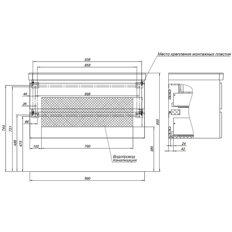 - Габариты корпуса тумбы (ШxВxГ): 990х502х458 мм.