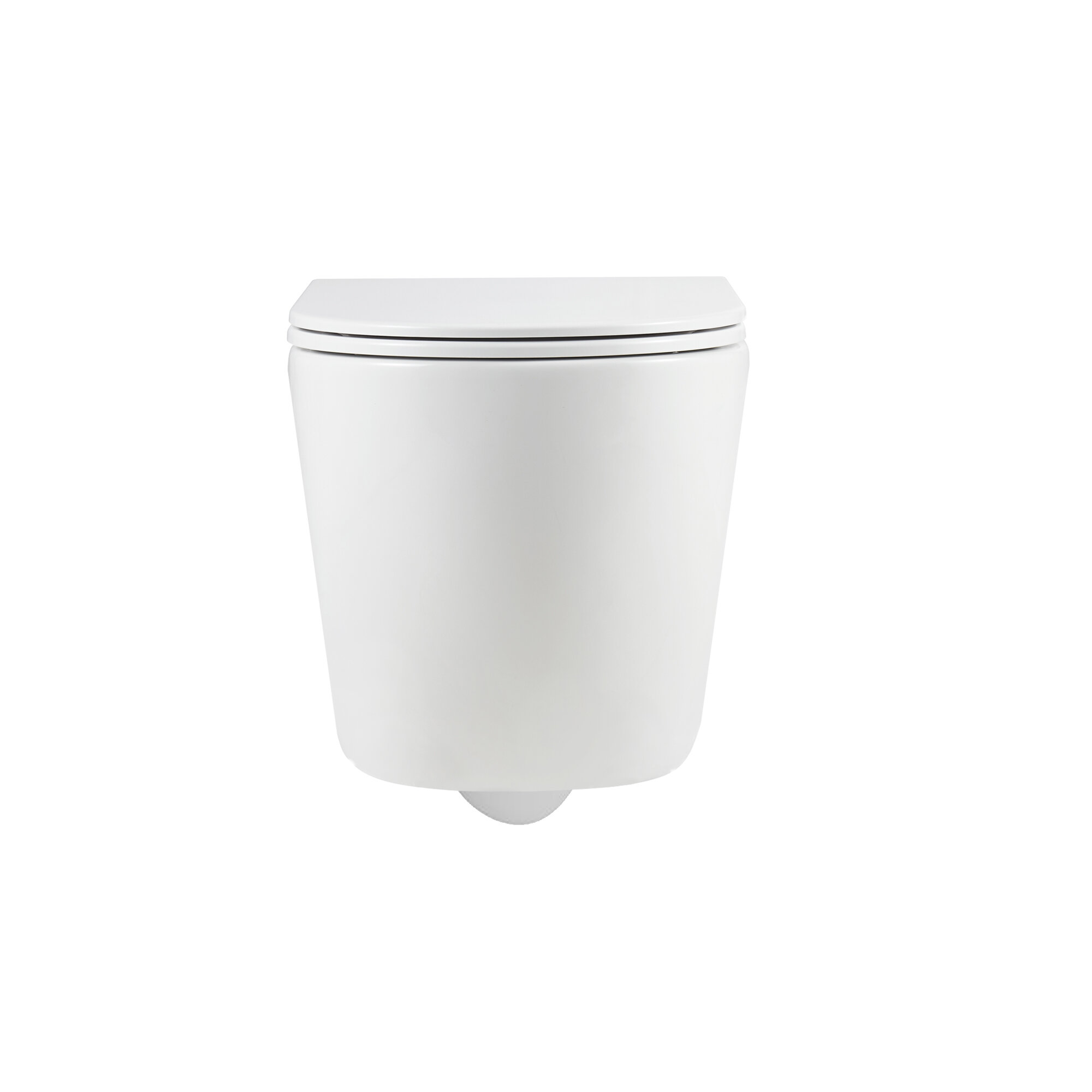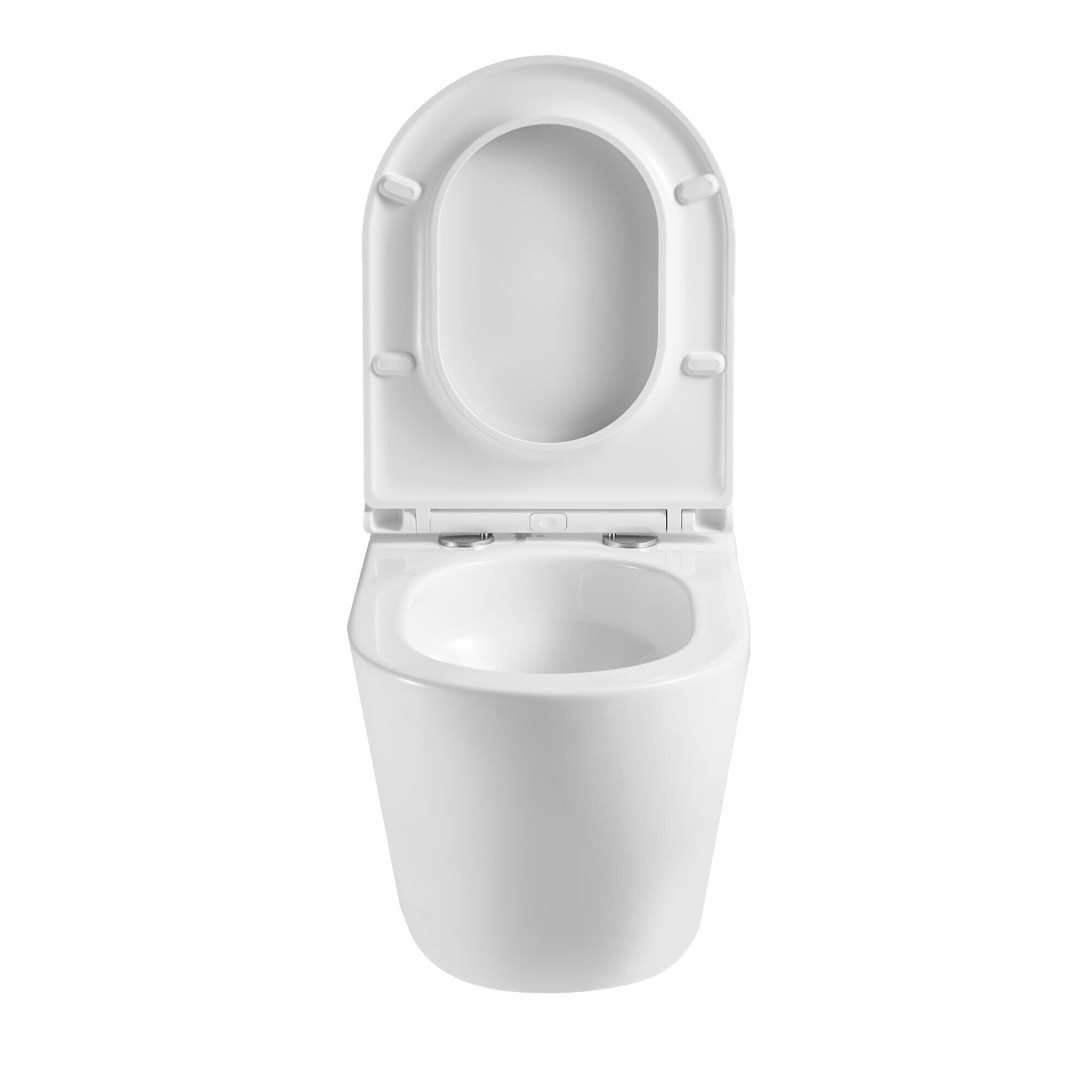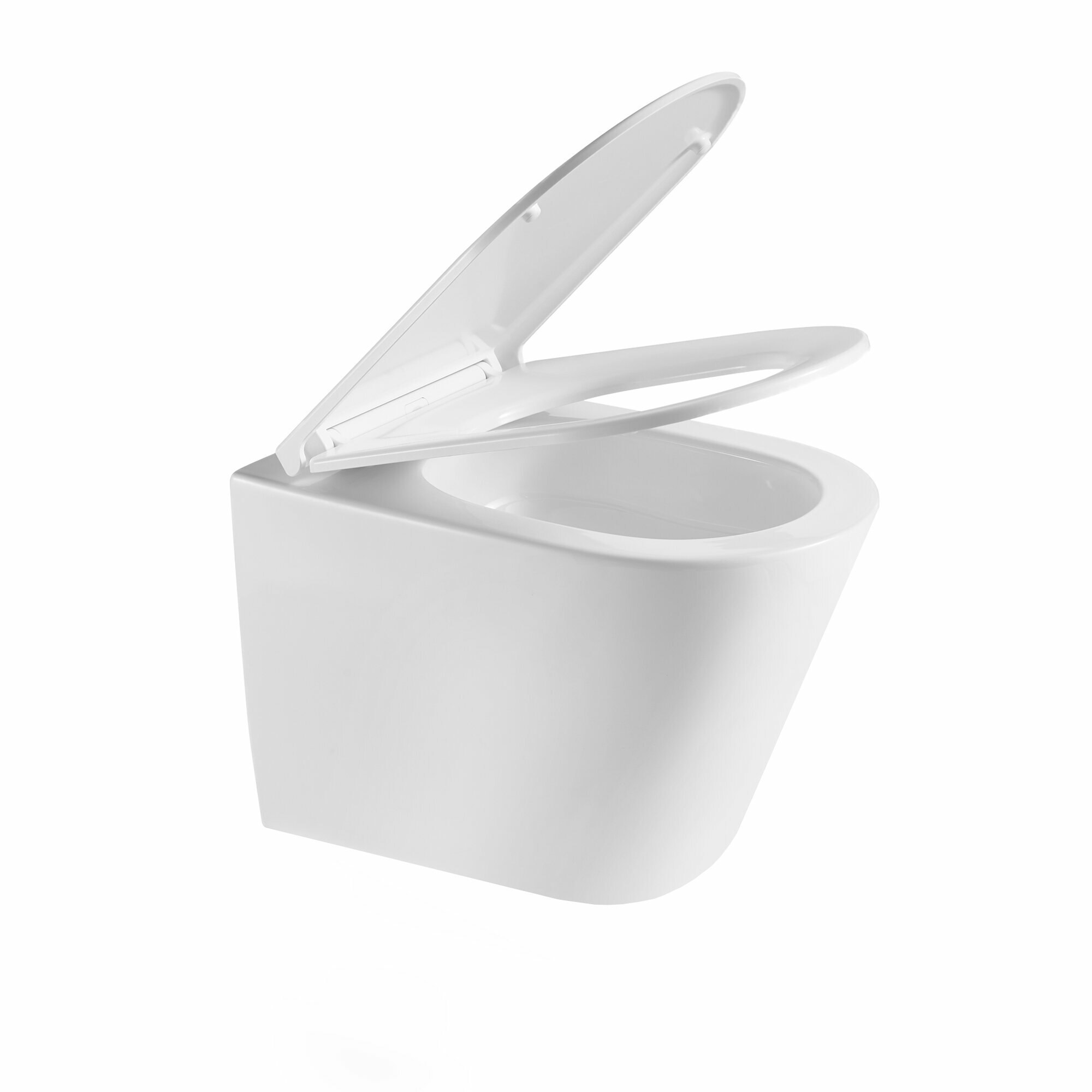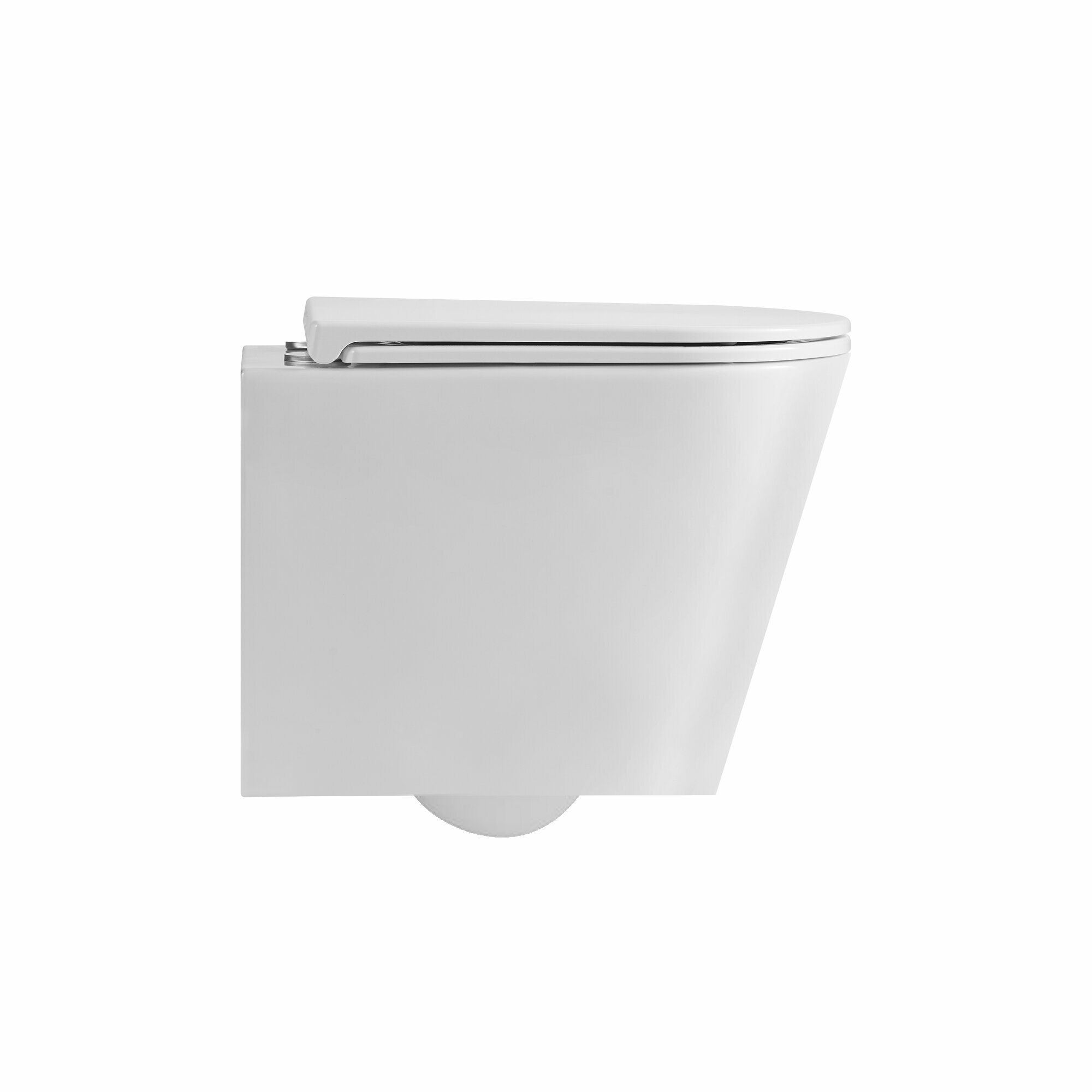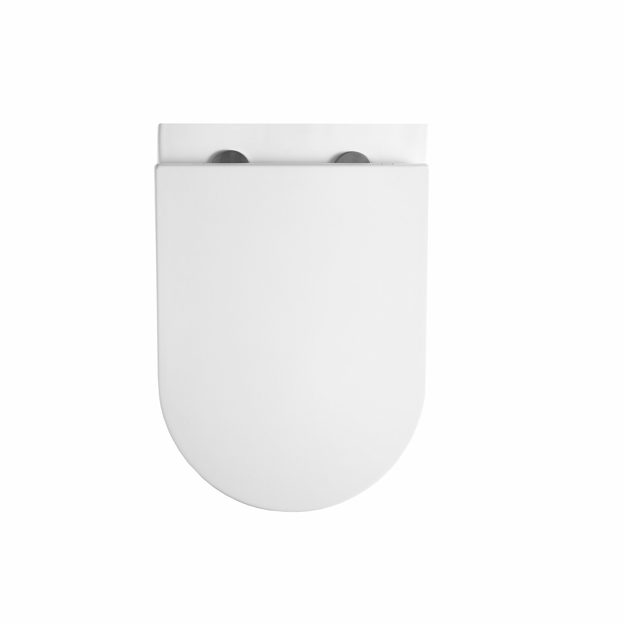 Безободковый, подвесной унитаз с ультратонким, антибактериальным сиденьем с плавным закрыванием и легкосъемным механизмом, петли хром.