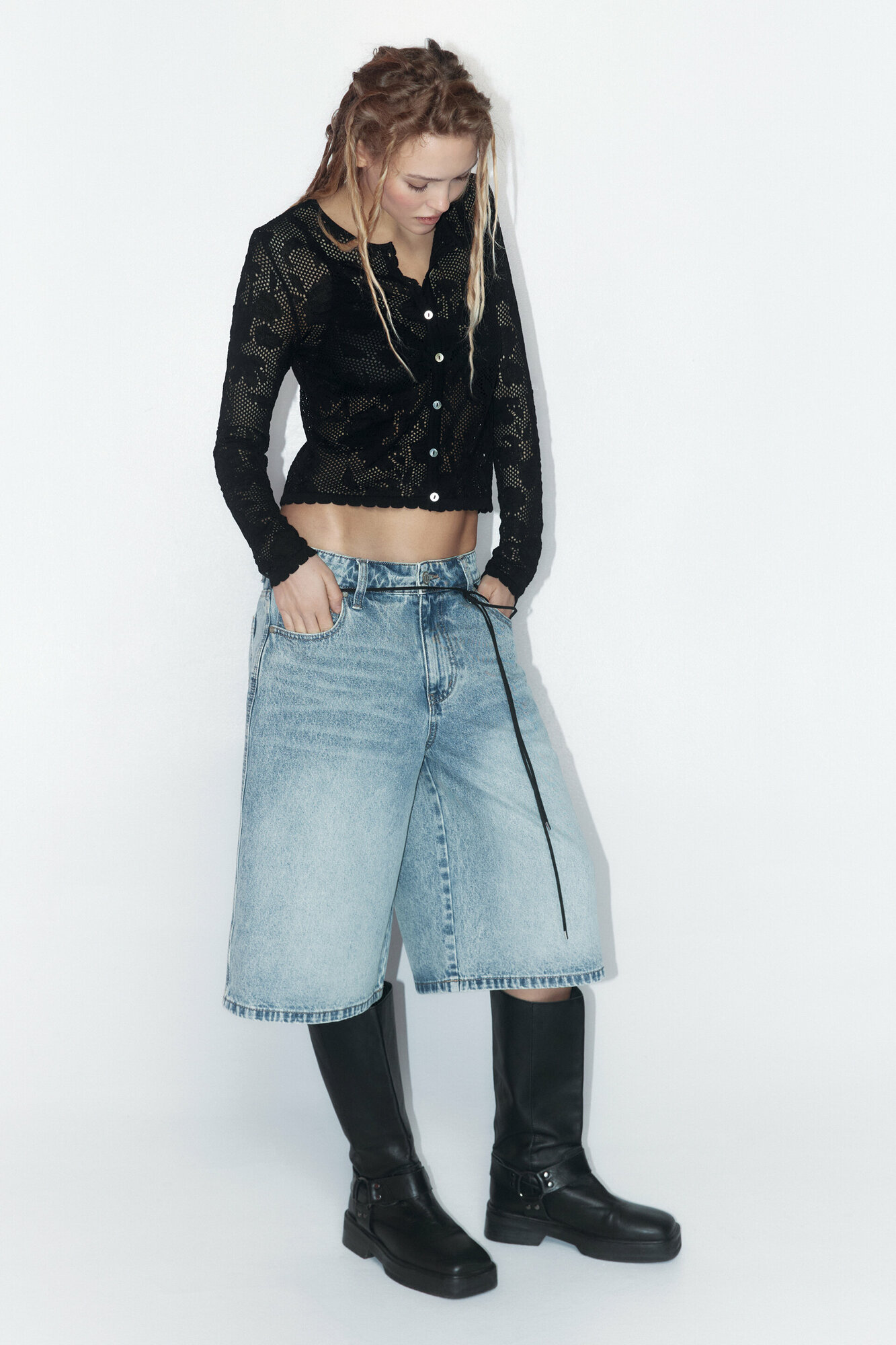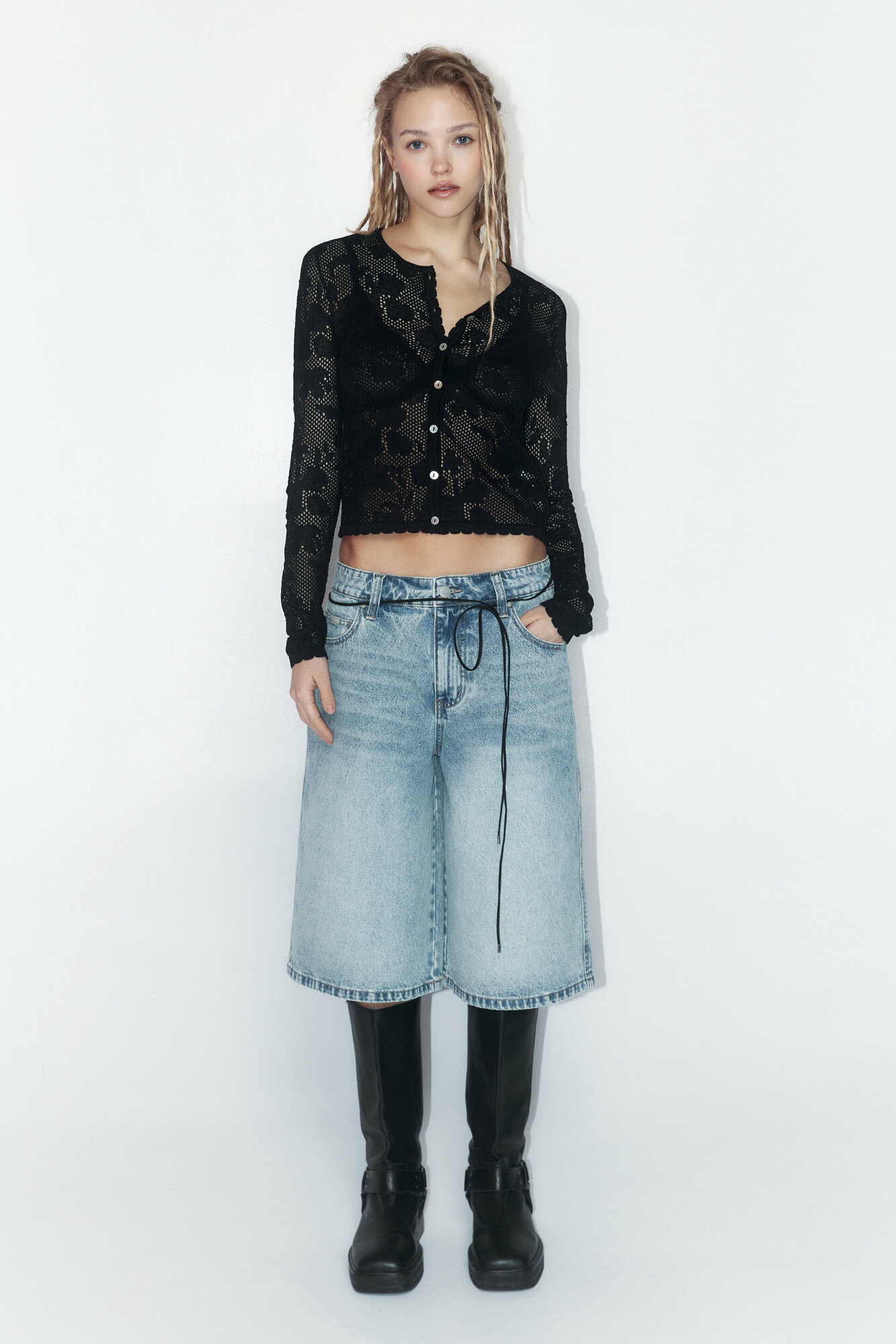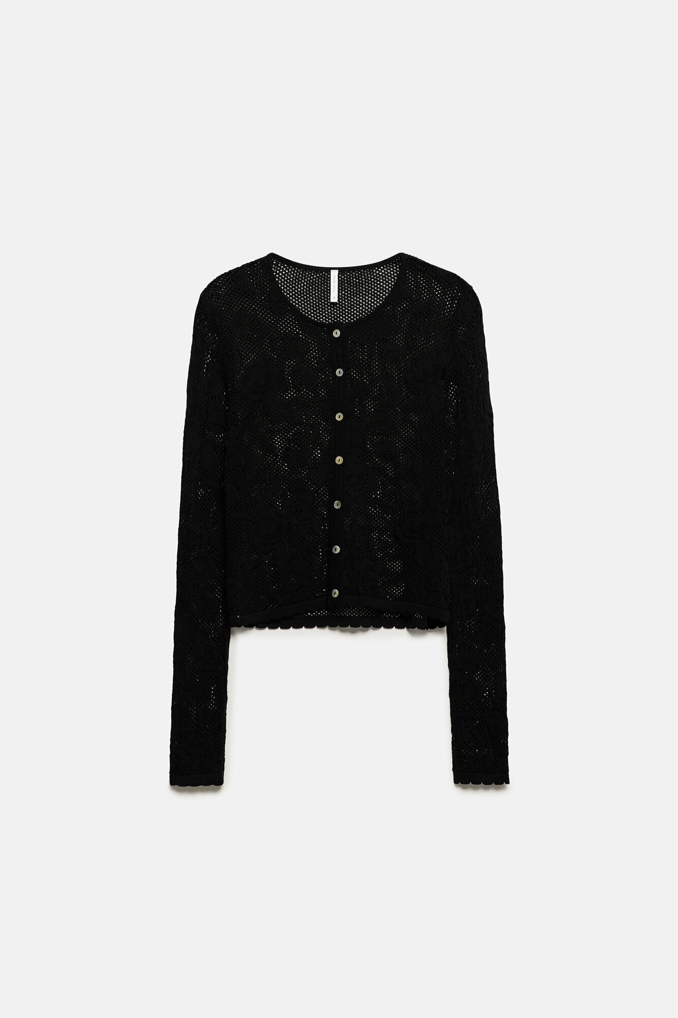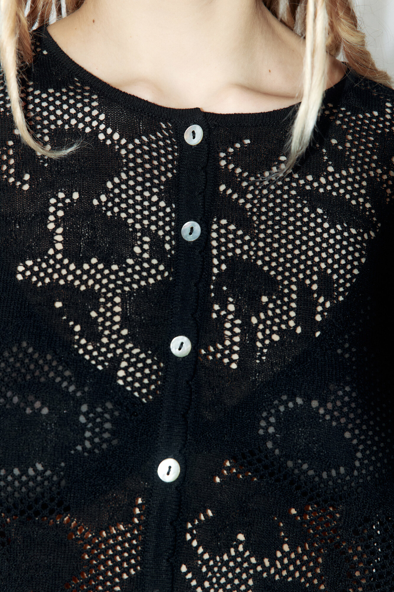 - Кардиган ажурный с цветами. Укороченный вязаный джемпер полуприлегающего кроя из мягкой, приятной к телу смесовой ткани на основе вискозы тонкой ажурной вязки