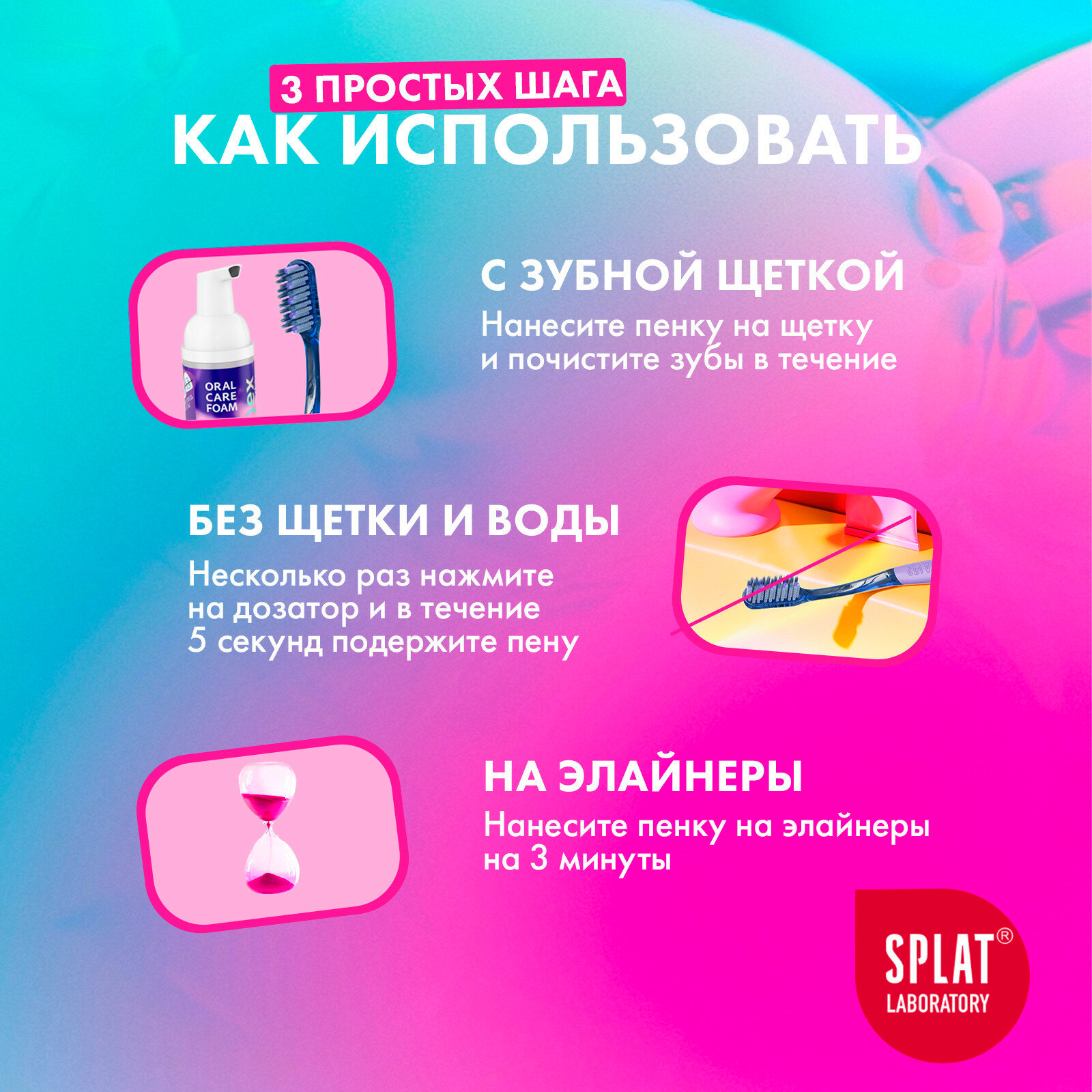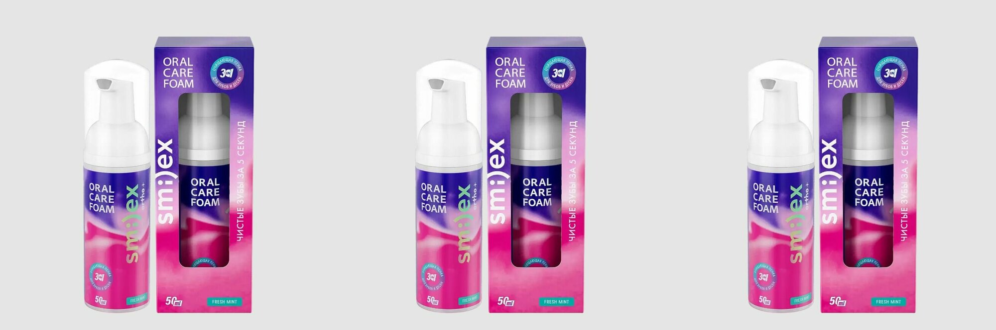 Инновационная очищающая пенка для зубов SPLAT SMILEX ORTHO+ 3-в-1 со вкусом мяты расщепляет мягкий налет в полости рта в ситуации, когда нет возможности полноценно почистить зубы в течение дня: например, после каждого приема пищи или окрашивающих напитков. Пенка эффективно освежает дыхание, способствует нормализации рН в полости рта. Входящий в состав запатентованный комплекс защищает от кариеса и снижает образование зубного налёта до 96 % достаточно просто прополоскать рот в течение 5 секунд.