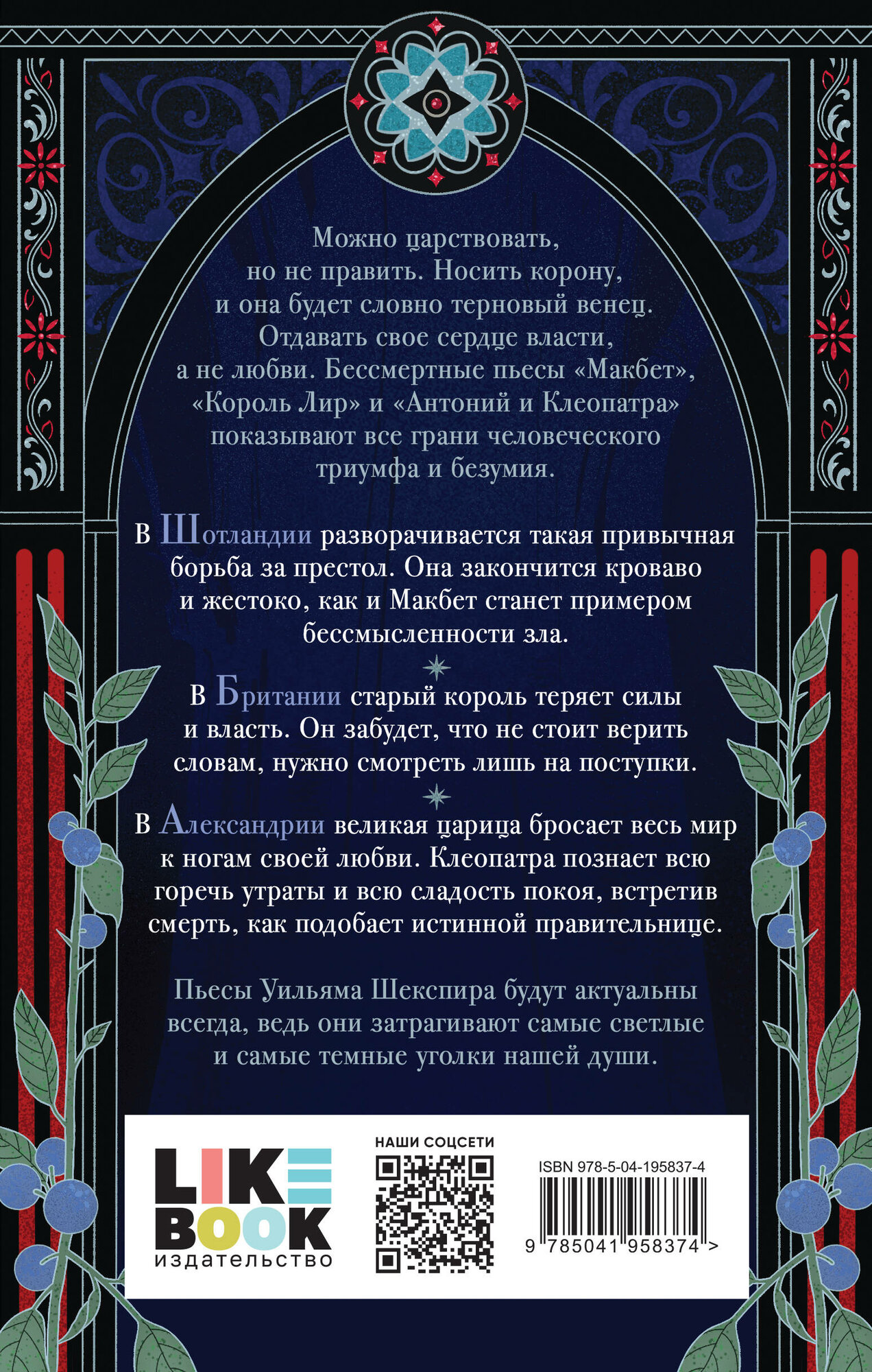 Можно царствовать, но не править. Носить корону, и она будет словно терновый венец. Отдавать свое сердце власти, а не любви. Бессмертные пьесы "Макбет", "Король Лир" и "Антоний и Клеопатра" показывают все грани человеческого триумфа и безумия. В Шотландии разворачивается такая привычная борьба за престол. Она закончится кроваво и жестоко, как и Макбет станет примером бессмысленности зла. В Британии старый король теряет силы и власть. Он забудет, что не стоит верить словам, нужно смотреть лишь на поступки. В Александрии великая царица бросает весь мир к ногам ее любви. Клеопатра познает всю горечь утраты и всю сладость покоя, встретив смерть как подобает истинной правительнице. Пьесы Уильяма Шекспира будут актуальны всегда, ведь они затрагивают самые светлые и самые темные уголки нашей души.