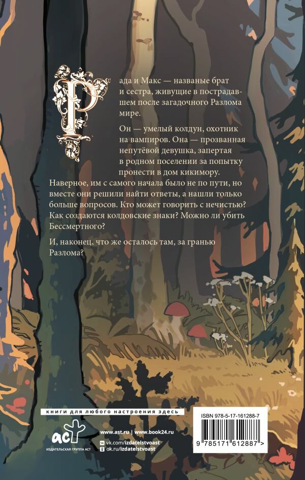 Рада и Макс - названые брат и сестра, живущие в пострадавшем после загадочного Разлома мире. Он - умелый колдун, охотник на вампиров. Она - прозванная непутевой девушка, запертая в родном поселении за попытку пронести в дом кикимору. Наверное, им с самого начала было не по пути, но вместе они решили найти ответы, а нашли только больше вопросов. Кто может говорить с нечистью? Как создаются колдовские знаки? Можно ли убить Бессмертного? И, наконец, что же осталось там, за гранью Разлома?