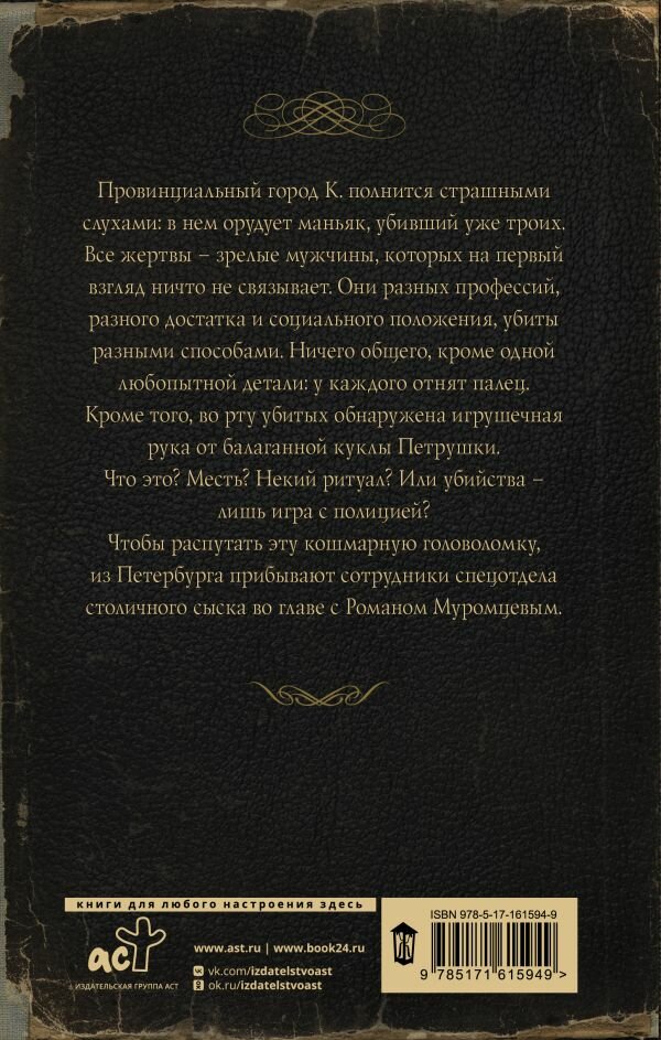 Провинциальный российский город К. полнится страшными слухами: в нем орудует маньяк, убивший уже троих. Все жертвы - взрослые мужчины, которых на первый взгляд ничто не связывает. Они разных профессий, разного достатка и социального положения, убиты разными способами. Ничего общего, кроме одной любопытной детали: у каждого отнят палец. Кроме того, во рту убитых обнаружена игрушечная рука от балаганной куклы Петрушки. Что это? Месть? Некий ритуал? Или убийства - лишь игра с полицией? Чтобы распутать эту кошмарную головоломку, из Петербурга прибывают сотрудники спецотдела столичного сыска во главе с Романом Муромцевым.