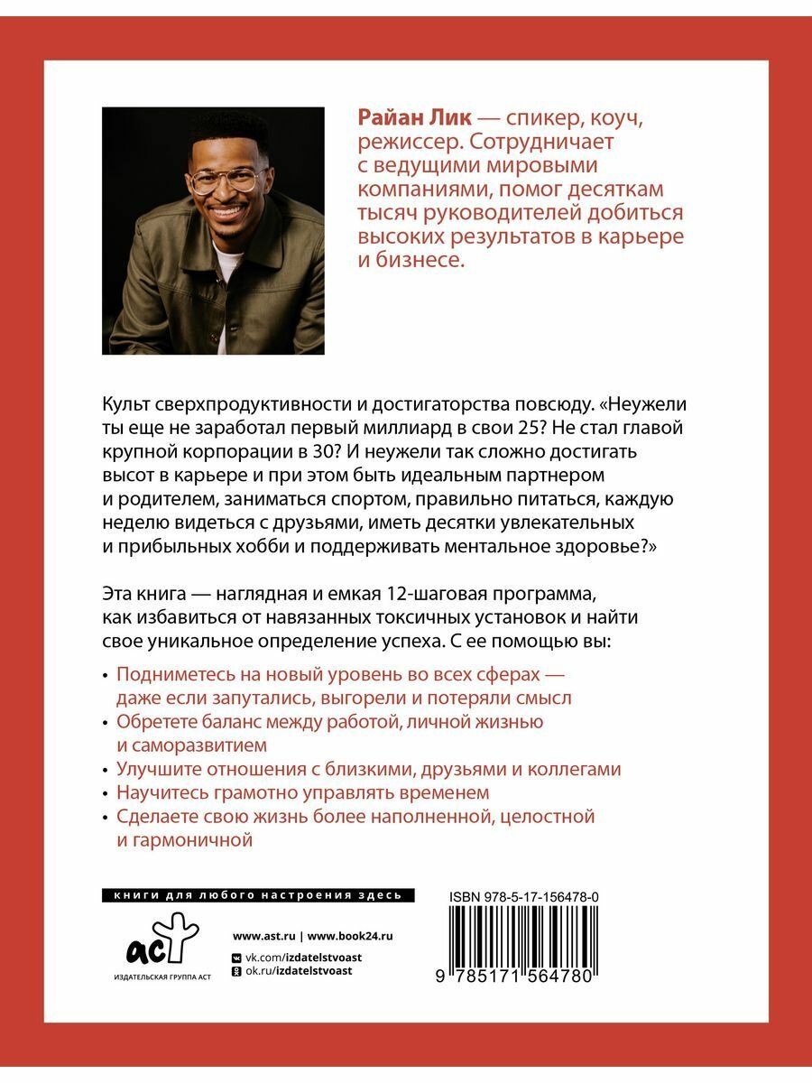 Райан Лик - спикер, коуч, режиссер. Сотрудничает с ведущими мировыми компаниями, помог десяткам тысяч руководителей добиться высоких результатов в карьере и бизнесе. Культ сверхпродуктивности и достигаторства повсюду. «Неужели ты еще не заработал первый миллиард в свои 25? Не стал главой крупной корпорации в 30? И неужели так сложно достигать высот в карьере и при этом быть идеальным партнером и родителем, заниматься спортом, правильно питаться, каждую неделю видеться с друзьями, иметь десятки увлекательных и прибыльных хобби и поддерживать ментальное здоровье? » Эта книга - наглядная и емкая 12-шаговая программа, как избавиться от навязанных токсичных установок и найти свое уникальное определение успеха. С ее помощью вы: - Подниметесь на новый уровень во всех сферах - даже если запутались, выгорели и потеряли смысл. - Обретете баланс между работой, личной жизнью и саморазвитием. - Улучшите отношения с близкими, друзьями и коллегами. - Научитесь грамотно управлять временем. - Сделаете свою жизнь более наполненной, целостной и гармоничной.