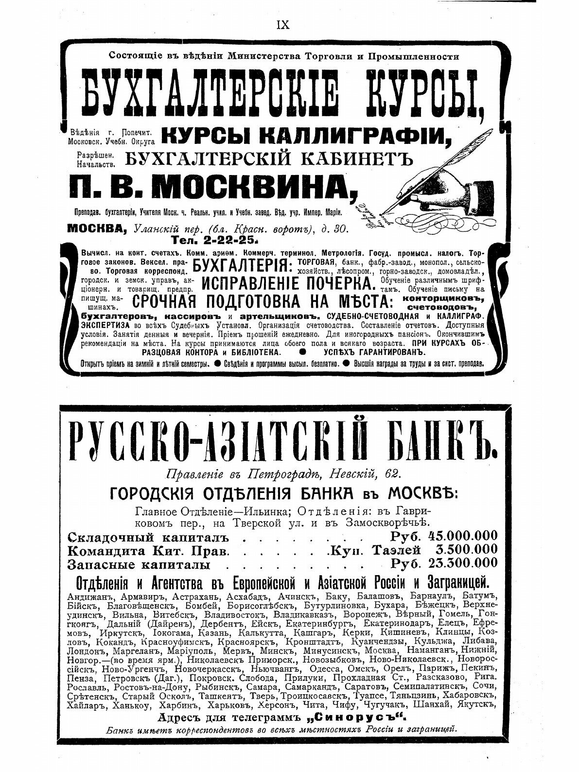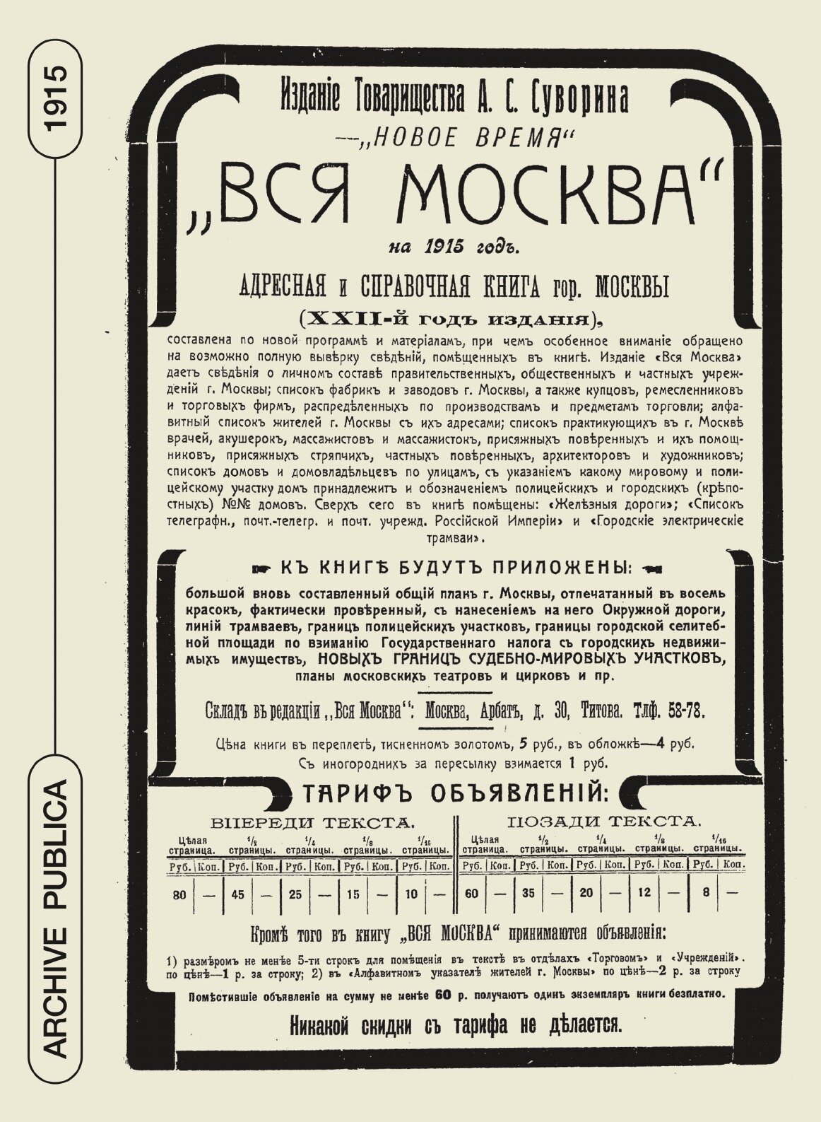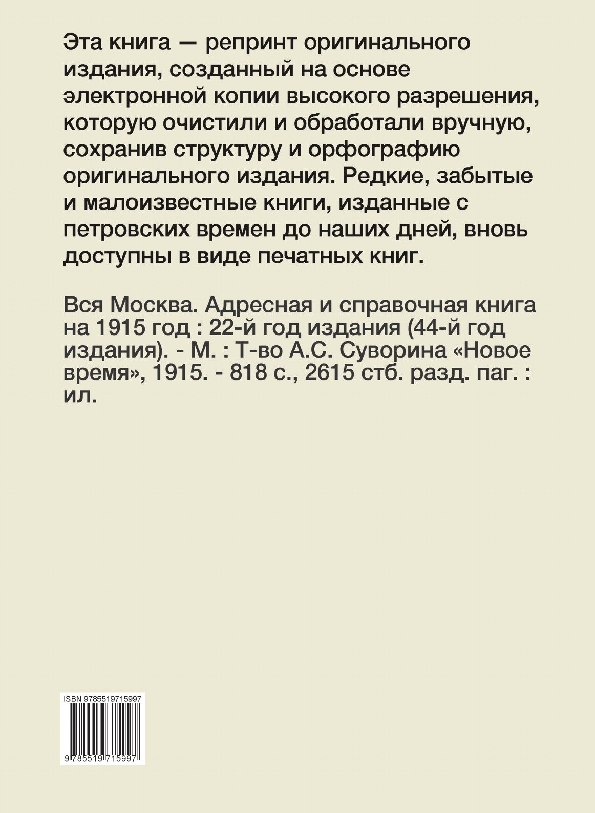 Вся Москва. Адресная и справочная книга на 1915 год : 22-й год издания (44-й год издания). - М. : Т-во А.С. Суворина "Новое время", 1915. - 818 с., 2615 стб. разд. паг. : ил.