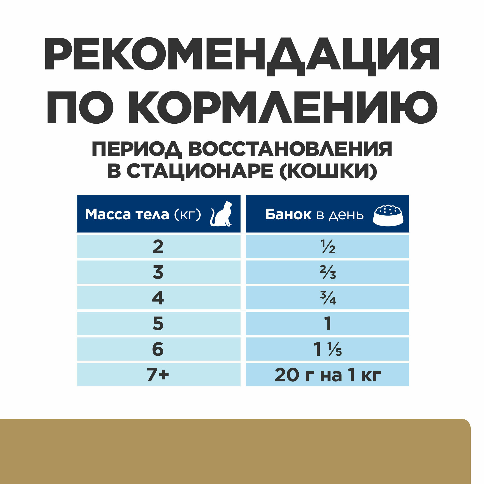 Влажный диетический корм для кошек и собак Hill's Prescription Diet A/D Urgent Care при реабилитации после болезней, с курицей. Обратитесь к ветеринарному специалисту за рекомендациями по кормлению Вашего питомца. При восстановлении после серьезного заболевания, травмы или хирургического вмешательства в организме кошки и собаки могут происходить значительные изменения метаболизма. В стрессовых условиях Вашему питомцу приходится больше поддерживать свои природные защитные силы, что делает еще более важным кормление специально сбалансированным рационом, чтобы помочь Вашему питомцу оправиться после тяжелого состояния.Ключевые особенности:Высококалорийный диетический корм для обеспечения энергией, необходимой в период реабилитации.Великолепный вкус, стимулирующий аппетит у питомца.Максимальная гибкость режима кормления и дозирования: например, с помощью миски, ложки, шприца и зонда, для обеспечения необходимыми питательными веществами тяжелобольных пациентов.Поддерживает здоровье иммунной системы и естественную способность питомца к заживлению и восстановлению.Без искусственных ароматизаторов, красителей и консервантов.Компания Hill's Pet Nutrition помогает улучшить качество жизни домашних животных и их владельцев во всем мире с 1939 года. Наша миссия - улучшить и продлить особые взаимоотношения между людьми и их питомцами. Hill’s активно поддерживает ветеринарных специалистов и приюты для животных по всему миру. Корма Hill’s производятся только в Европе и США, рекомендованы ветеринарными специалистами.Основные показания:Анорексия.Кахексия и потеря весаИстощение, недостаточное питание, период выздоровления.Липидоз печени (неэнцефалопатический) у кошек.Гиперметаболические состояния.Гипогликемия.Инсулинома.Неоплазия, большинство форм.Хирургическое вмешательство (до и после операции).Кормление с помощью зонда или шприца.Не рекомендуется: щенкам, беременным или кормящим собакам.Состав: мясо и производные животного происхождения (курица 13 %), злаки, масла и жиры, минералы, яйцо и его производные, различные виды сахаров.Легкопереваримые ингредиенты: индейка, свинина, курица, рисовая мука, рыбий жир, сухой яичный белок.Гарантированный анализ:Белок – 12,9 %Жир – 8,9 %Сырая клетчатка - 0,05 %Сырая зола – 2,5 %Влага – 72,7 %Кальций – 0,31 %Фосфор - 0,27 %Натрий - 0,25 %Калий - 0,31 %Магний - 0,03 %Добавки (на 1 кг): (витамин А) – 25 557МЕ, (витамин D3) – 368 МЕ, 3b103 (Железо) 22,4мг, 3b202 (Йод) 0,7мг, 3b405 (Медь) 2,8мг, 3b502 (Марганец) 8,6мг, 3b603 (Цинк) 31,6мг.Энергетическая ценность: 131 кКал/100 гр.Страна-производитель: Италия.