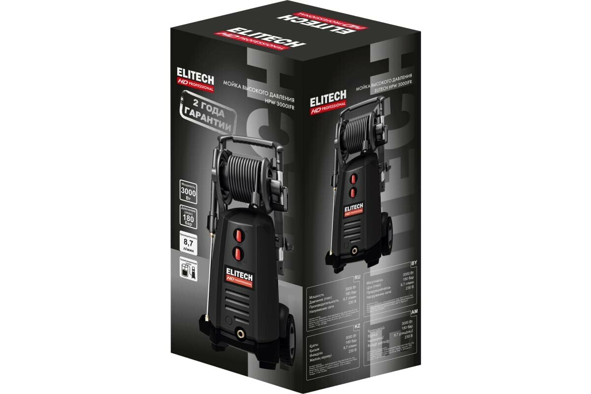 Мойка высокого давления Elitech HD HPW 3000IFR для очищения автомобилей, террас, тротуаров, фасадов, дорожек и плитки. Объем бачка 0,8 л — можно не контролировать заправку моющим средством. Длина шланга — 10 м, длина кабеля — 5 м, позволяют свободно перемещаться и дотянуться до отдаленных углов. Есть катушка для намотки шланга и колесики — удобно хранить и переносить. Алюминиевая самовсасывающая помпа обеспечивает непрерывную работу. Напряжение от сети — 220 В. Давление на выходе — 180 МПа/бар.