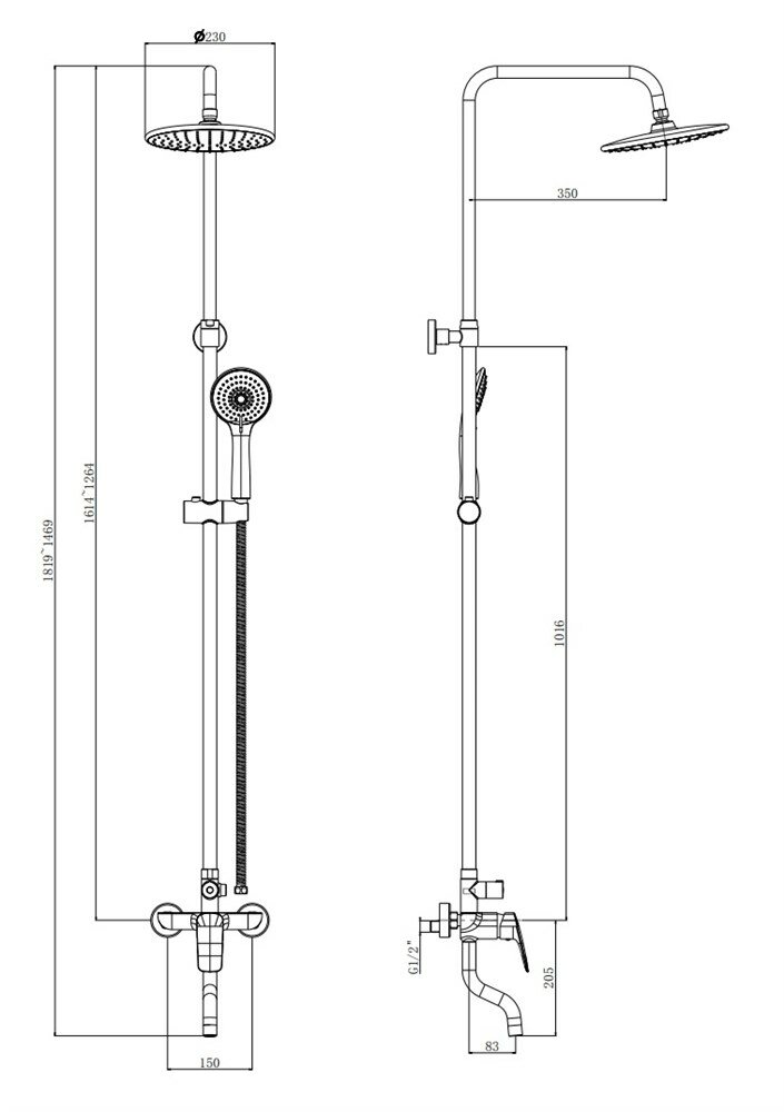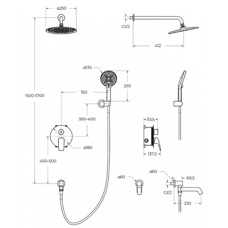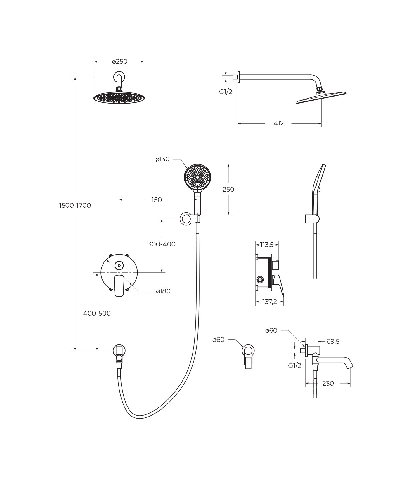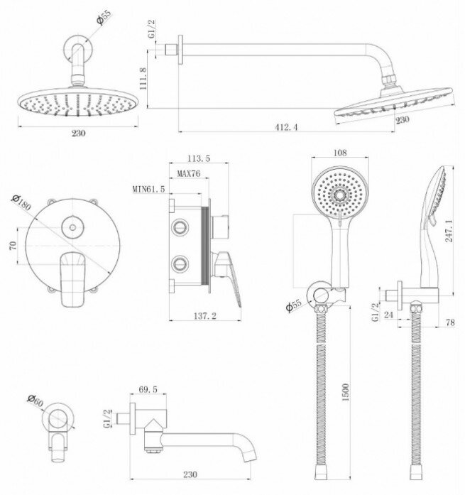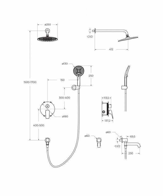 | Состав комплекта | верхний душ, настенный держатель, смеситель, излив, душевой гарнитур |