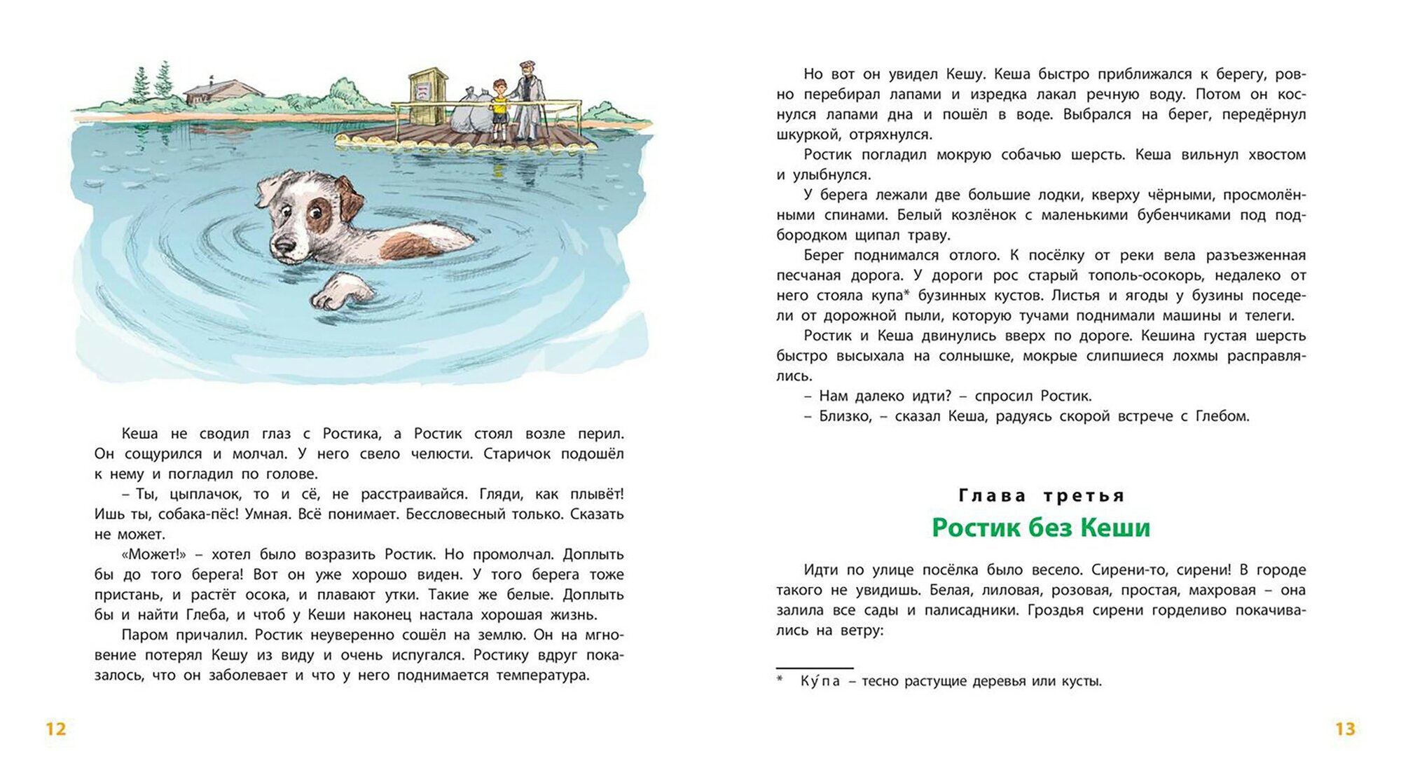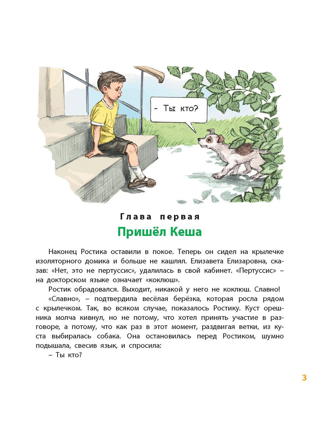 Мама всегда говорила шестилетнему Ростику: тем, кто попал в беду, нужно помогать! И вот однажды Ростик повстречал собаку по кличке Кеша. Кеше нужна помощь: его выгнали из дома, а он мечтает вернуться обратно к хозяину. Конечно, мальчик не может бросить собаку в беде. И друзья отправляются в полное приключений путешествие. Добрую историю о трогательной дружбе между маленьким мальчиком и бездомной собачкой написала известная советская писательница Ирина Токмакова, а нежные иллюстрации к книге нарисовал художник Николай Панин. Для старшего дошкольного и младшего школьного возраста.
