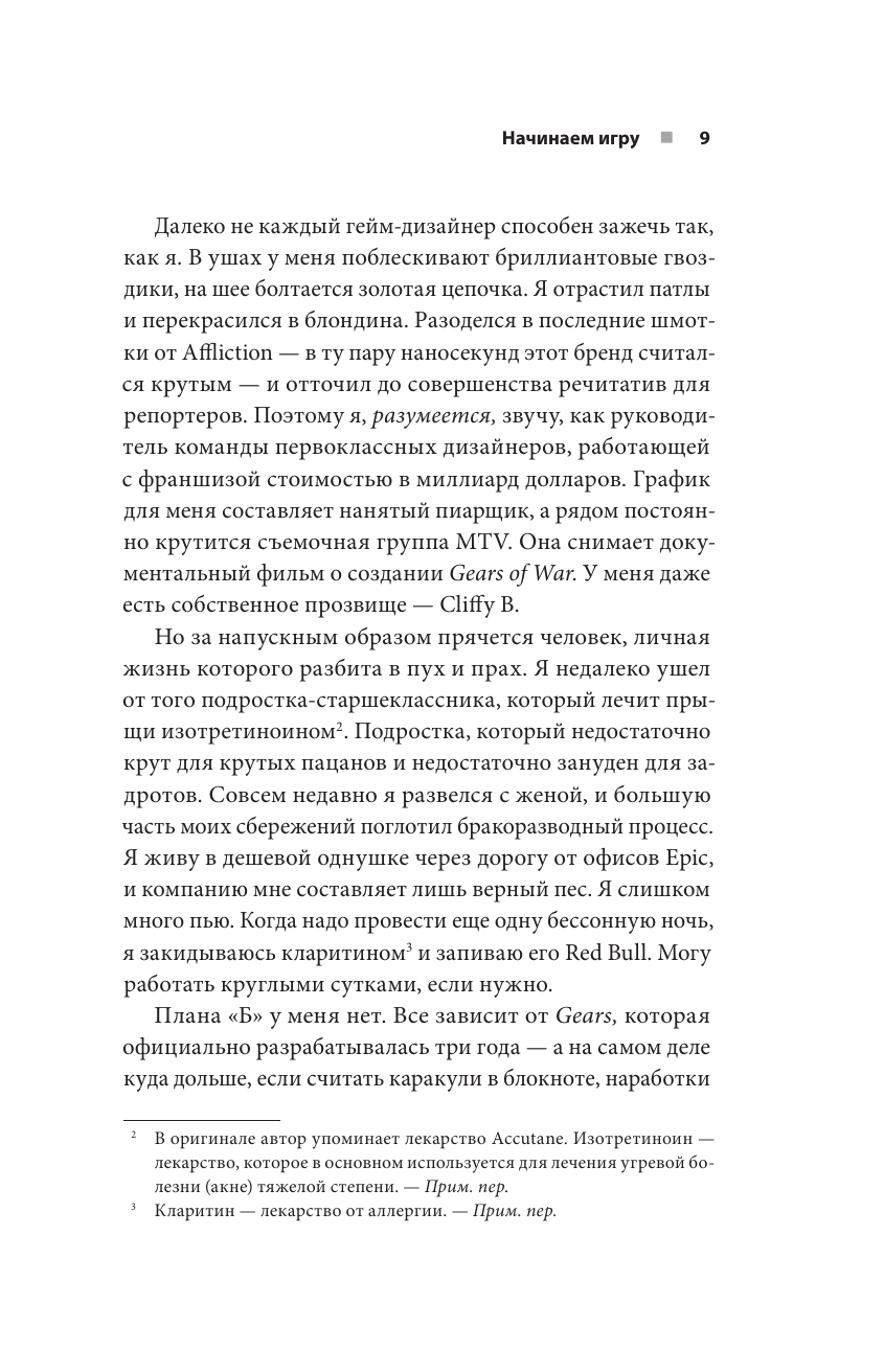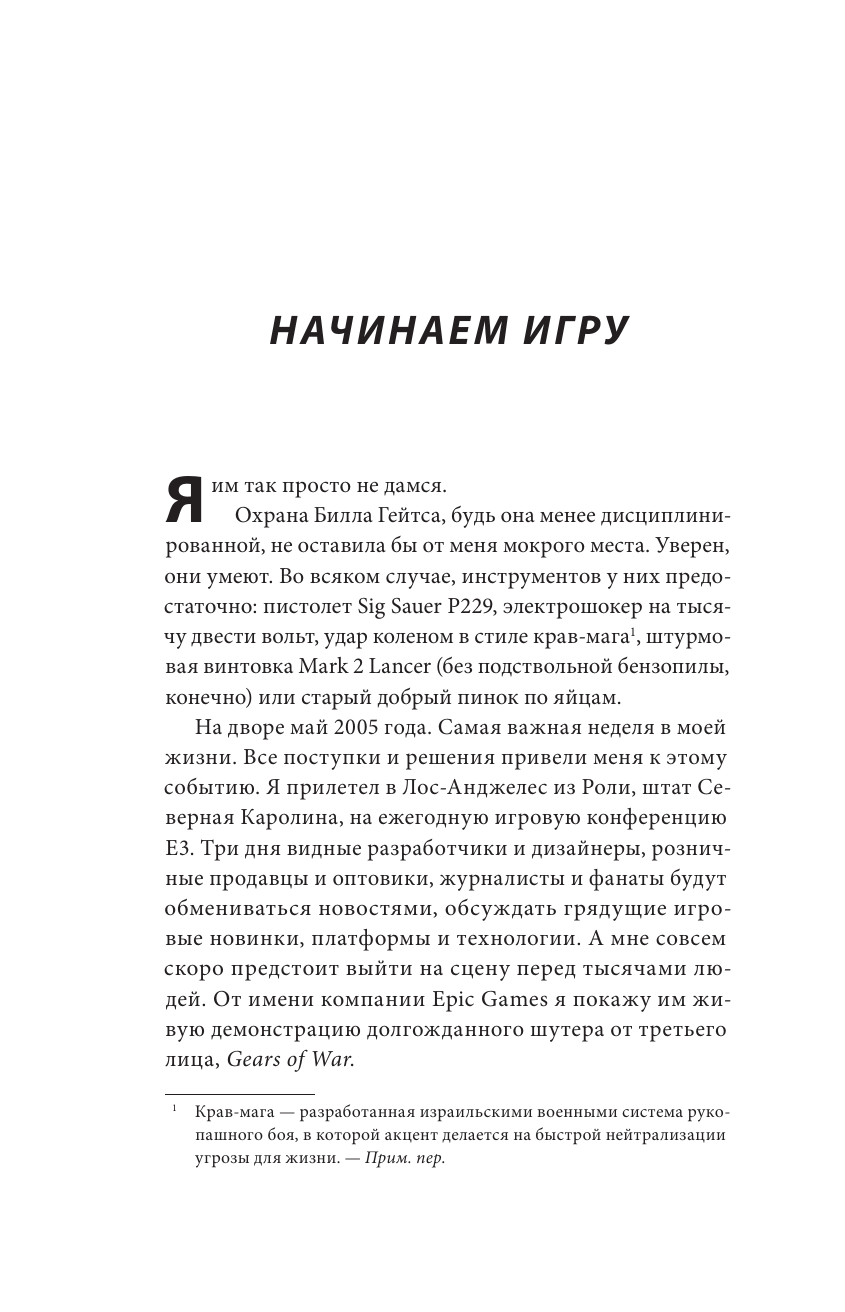 Клифф Блезински - или CliffyB, как он известен среди геймеров, - разработчик Unreal и Gears of War. Он один из немногих гейм-дизайнеров, кто достиг мифического статуса рок-звезды. В этой автобиографии он без утайки рассказывает свою захватывающую личную историю, которая идет рука об руку с развитием индустрии видеоигр. Блезински создал первую игру еще до окончания средней школы, а в семнадцать присоединился к молодой компании под названием Epic Games, где его ждали изнурительные часы работы и реализация уникального творческого потенциала. Он подробно описывает, как Epic стала лидером отрасли - во многом благодаря его работе над франшизами Unreal и Gears of War (и его вкладу в игру Fortnite). Вы узнаете, как из застенчивого прыщавого интроверта Блезински превратился в знаменитость за рулем спортивного автомобиля. Книга пронизана юмором, но при этом рассуждает о проблемах, с которыми давно сталкивается игровое сообщество. Это по-настоящему вдумчивые и вдохновляющие мемуары, которые на живом примере покажут вам, что игры - это настоящий вид искусства и насколько неординарные люди их создают. "Если вы ждали скучной биографии скучного игрового дизайнера, то проходите мимо. Блезински рассказывает обезоруживающе искреннюю историю о том, что игры - самый быстрый социальный лифт. Игры способны изменить вашу жизнь, исполнить любые желания и провести к звездам через любые тернии". - Андрей Подшибякин, креативный директор Xsolla, писатель "Честный, захватывающий взгляд на жизнь и карьеру одной из крупнейших и самых дерзких личностей в индустрии видеоигр. Блезински предлагает изучить мышление культового дизайнера: изобретательность, неуверенность в себе и напряженную творческую алхимию, которая оживляет видеоигры". - Джейсон Шрейер, автор бестселлеров "Кровь, пот и пиксели" и "Нажми Reset"