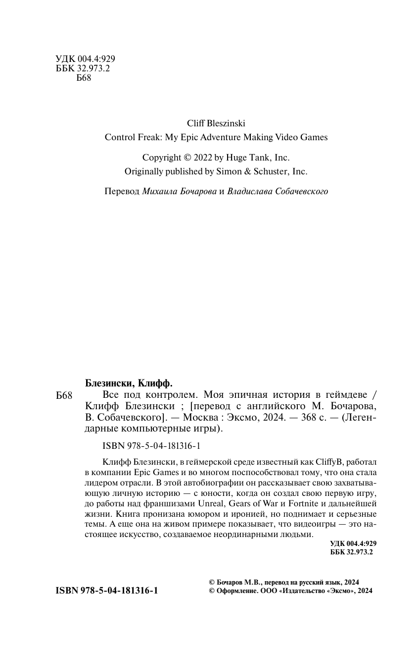 Все под контролем. Моя эпичная история в геймдеве (Блезински Клифф); ООО "Издательство "Эксмо", 2024