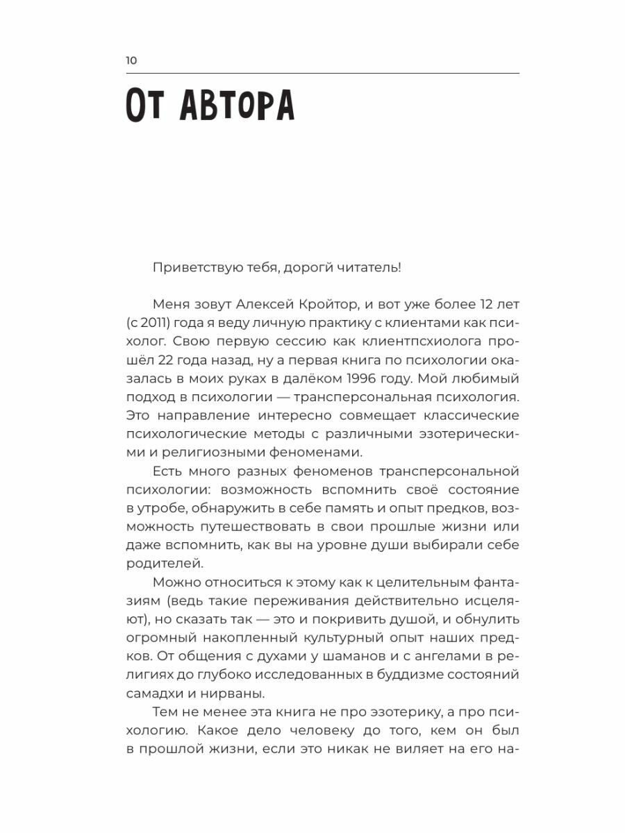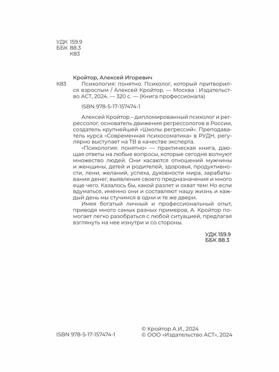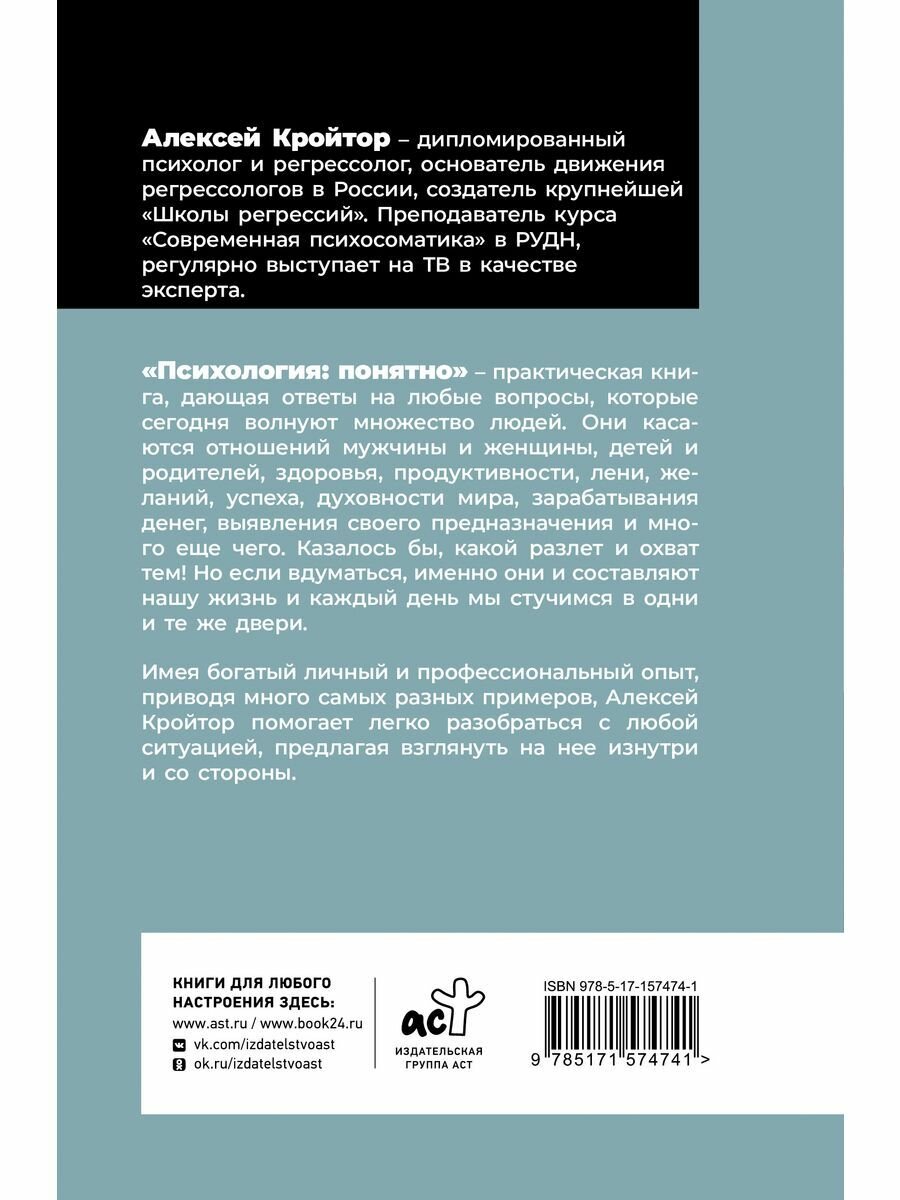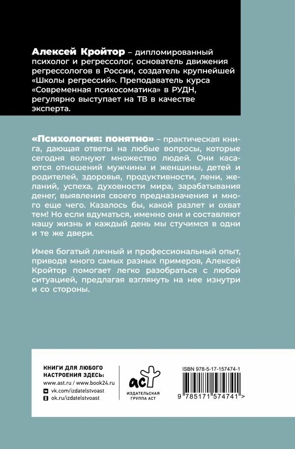Алексей Кройтор – дипломированный психолог и регрессолог, основатель движения регрессологов в России, создатель крупнейшей «Школы регрессий». Преподаватель курса «Современная психосоматика» в РУДН, регулярно выступает на ТВ в качестве эксперта. «Психология: понятно» — практическая книга, дающая ответы на любые вопросы, которые сегодня волнуют множество людей. Они касаются отношений мужчины и женщины, детей и родителей, здоровья, продуктивности, лени, желаний, успеха, духовности мира, зарабатывания денег, выявления своего предназначения и много еще чего. Казалось бы, какой разлет и охват тем! Но если вдуматься, именно они и составляют нашу жизнь и каждый день мы стучимся в одни и те же двери. Имея богатый личный и профессиональный опыт, приводя много самых разных примеров, А. Кройтор помогает легко разобраться с любой ситуацией, предлагая взглянуть на нее изнутри и со стороны.
