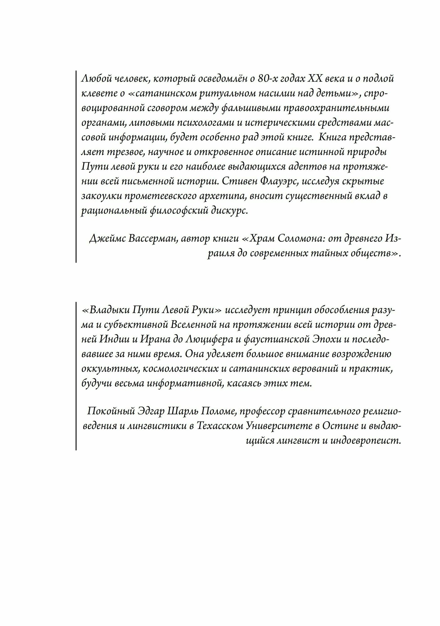 Путь левой руки — от чёрной магии и сатанизма до гностических сект и Четвёртого пути Гурджиева — связан со многими практиками, культами и персоналиями, жившими на протяжении многих веков. Стивен Флауэрс, доктор философии, исследует методы, учения и историческую роль Пути левой руки — от его истоков в индийской тантрической философии до его глубинного влияния на современные мировые события — и показывает, каких философов, магов и деятелей оккультизма, появлявшихся на арене мировой истории, можно назвать «Владыками Пути Левой Руки».