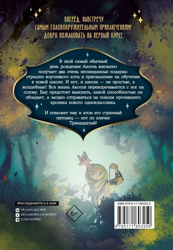 В свой самый обычный день рождения Аксель внезапно получает два очень неожиданных подарка: страшно ворчливого кота и приглашение на обучение в новой школе. И кот, и школа – не простые, а волшебные! Вся жизнь Акселя переворачивается с ног на голову. Ему предстоит выяснить, какой способностью он обладает, а заодно отправиться на поиски пропавшего кролика нового одноклассника. И поможет ему в этом его странный питомец – кот по кличке Тринадцатый! Вперёд, навстречу самым головокружительным приключениям! И добро пожаловать на первый курс!