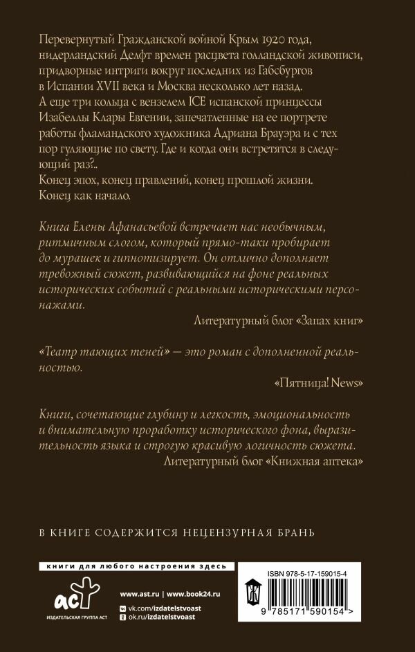 Перевернутый Гражданской войной Крым 1920 года, нидерландский Делфт времен расцвета голландской живописи, придворные интриги вокруг последних из Габсбургов в Испании XVII века и Москва несколько лет назад. И три кольца с вензелем ICE испанской принцессы Изабеллы Клары Евгении, запечатленные на ее портрете работы фламандского художника Адриана Брауэра, и с тех пор гуляющие по свету. Где и когда они встретятся в следующий раз?..Конец эпох, конец правлений, конец прошлой жизни. Конец как начало.Вторая книга трилогии Елены Афанасьевой "Театр тающих теней".