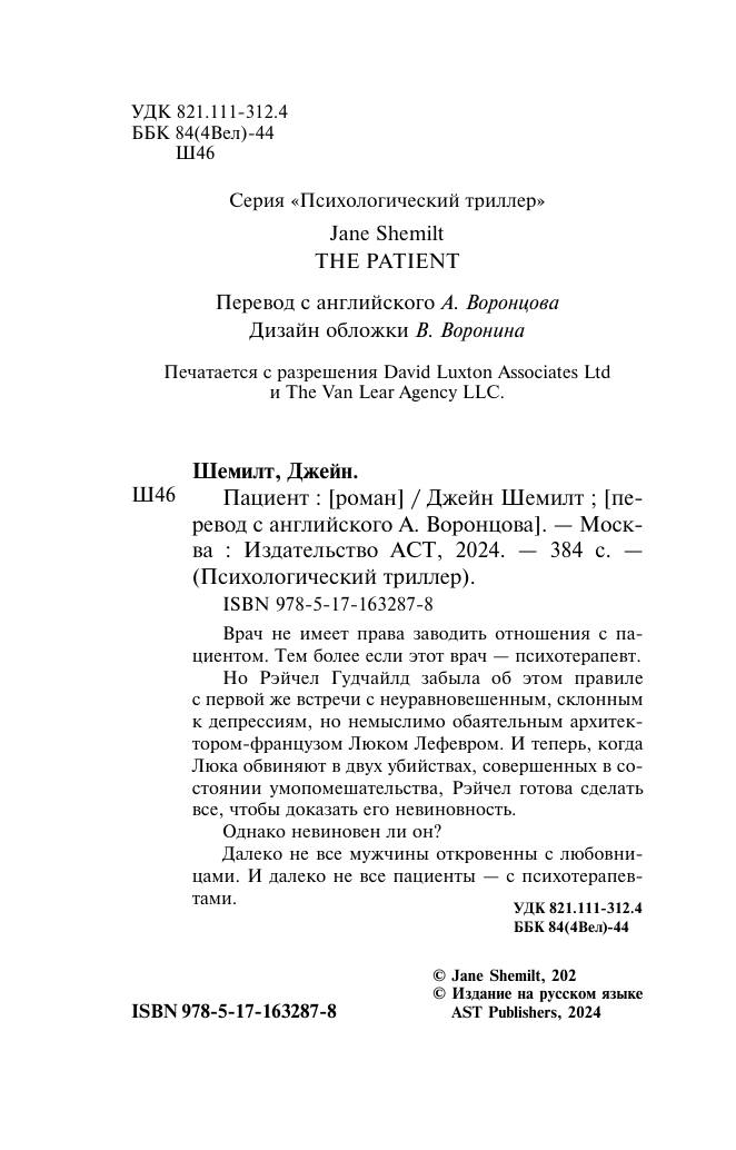 Книга: Пациент (Джейн Шемилт); АСТ, Neoclassic, 2024