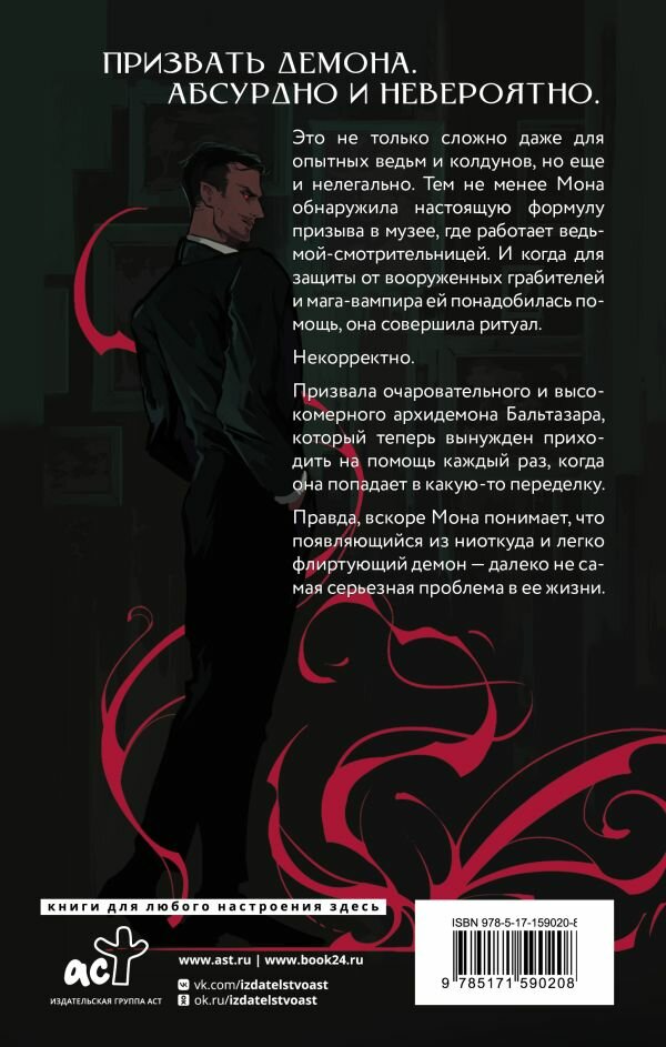 Призвать демона. Абсурднее просто некуда и невероятнее — тоже. Такое с трудом удавалось старым колдунам и ведьмам, имеющим опыт проведения ритуалов, и ко всему прочему это крайне нелегально. Да и кто стал бы выставлять настоящую формулу призыва? Тем не менее, Мона обнаружила ее в музее, где работает ведьмой-смотрительницей. И когда для защиты от вооруженных грабителей и мага-вампира ей понадобилась помощь, она совершила ритуал.Некорректно.Призвала очаровательного и высокомерного архидемона Бальтазара, который теперь вынужден приходить на помощь каждый раз, когда она попадает в какую-то переделку.Правда, вскоре Мона понимает, что появляющийся из ниоткуда и легко флиртующий демон — далеко не самая серьезная проблема в ее жизни.