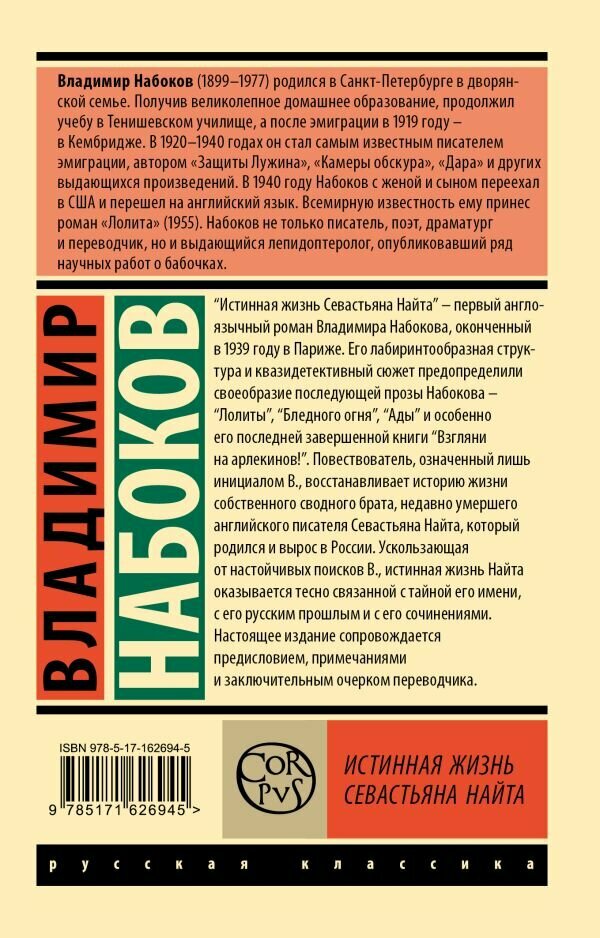 "Истинная жизнь Севастьяна Найта" — первый англоязычный роман Владимира Набокова, оконченный в 1939 году в Париже и два года спустя опубликованный в США. Его лабиринтообразная структура и квазидетективный сюжет предопределили своеобразие последующей прозы Набокова — "Лолиты", "Бледного огня", "Ады" и особенно его последней завершенной книги "Взгляни на арлекинов!". Повествователь, означенный лишь инициалом В., восстанавливает историю жизни собственного сводного брата, покойного писателя Севастьяна Найта (Sebastian Knight), используя воспоминания, устные рассказы и отрывки из его книг. Ускользающая от настойчивых поисков В., истинная жизнь Найта оказывается непосредственно связанной с тайной его имени, с его сочинениями, с законами словесного искусства и с метафизикой Набокова.Настоящее издание романа сопровождается предисловием, примечаниями и заключительным очерком переводчика.Сохранены особенности орфографии, пунктуации и транслитерациипереводчика.