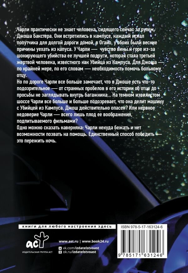Чарли практически не знает человека, сидящего сейчас за рулем, Джоша Бакстера. Они встретились в кампусе, каждый искал попутчика для долгой дороги домой, в Огайо, у обоих были веские причины уехать. У Чарли — чувство вины и горе из-за убийства лучшей подруги, которая стала третьей жертвой человека, известного как Убийца из кампуса. Для Джоша — по крайней мере по его словам — необходимость помочь больному отцу.Но по дороге Чарли все больше замечает, что в Джоше есть что-то подозрительное, от странных пробелов в истории об отце, до просьбы не заглядывать внутрь багажника... На темном, извилистом шоссе Чарли все больше подозревает, что делит машину с Убийцей из кампуса. Джош действительно опасен? Или недоверие Чарли — всего лишь плод ее воображения, подпитываемого фильмами?Одно можно сказать наверняка — Чарли некуда бежать и нет возможности позвать на помощь. Единственный способ победить — это пережить ночь.