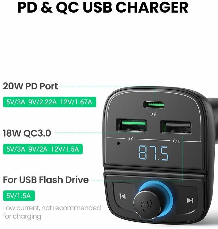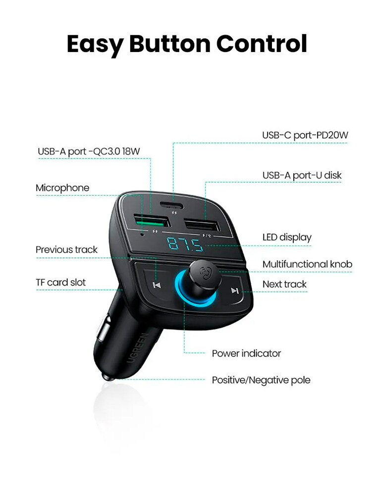 Зарядное устройство автомобильное UGREEN 80910 FMBT Transmitter Car Charger+TF Slot черный CD229