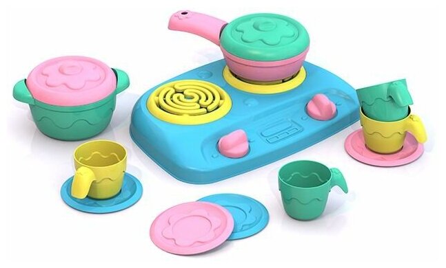 В этот набор входит все необходимое для того, девочка смогла почувствовать себя настоящей хозяйкой на своей маленькой импровизированной кухне. Кастрюлька и сковородка накрываются крышками, а на плите есть рычажки и варочная поверхность в виде спирали, совсем как у настоящей электрической. Вся посудка объединена общим дизайном и окрашена в нежные цвета.
