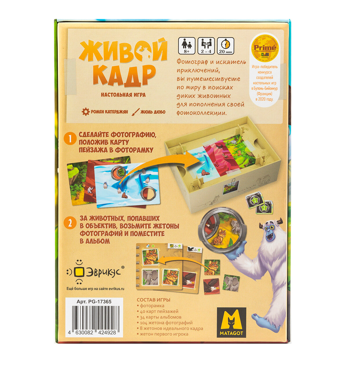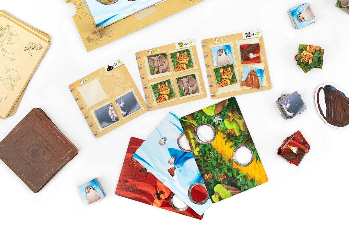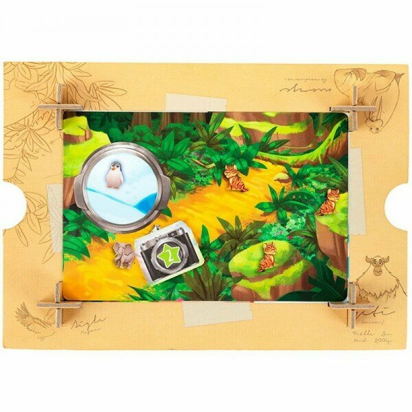 | Комплектация | Фоторамка 40 карт пейзажей 34 карты альбомов 104 жетона фотографий 8 жетонов идеального кадра Жетон первого игрока Правила игры |