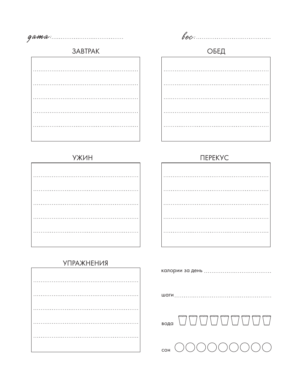 Дневник питания и тренировок на 12 недель - твой идеальный спутник в достижении цели! Улучшай свое тело осознанно: измерь свои параметры в начале пути и запиши желаемые, продумывай меню на каждую неделю и составляй список покупок, записывай ежедневные результаты (потребление калорий, сон, вода, шаги, вес), подводи итоги недели и ставь цели на будущую. У тебя все получится!