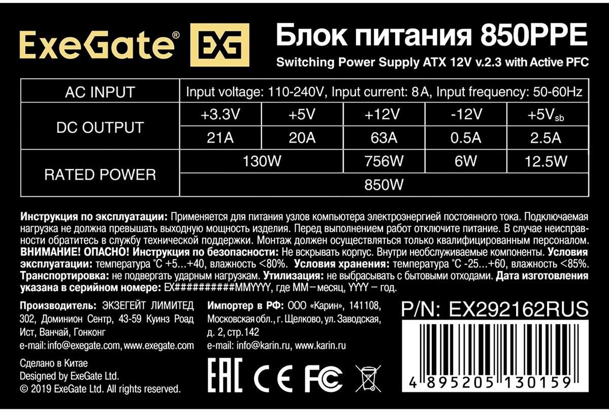 Блок питания ATX Exegate 850PPE 850W APFC 80 PLUS 120mm fan EX292162RUS