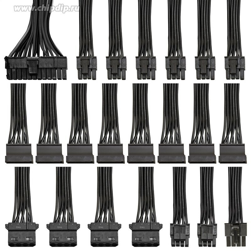 | Разъемы | MB 20+4 pin, CPU 2x(4+4) pin, питание видеокарты 6х(6+2) pin, SATA 8 шт, Molex 4 шт |